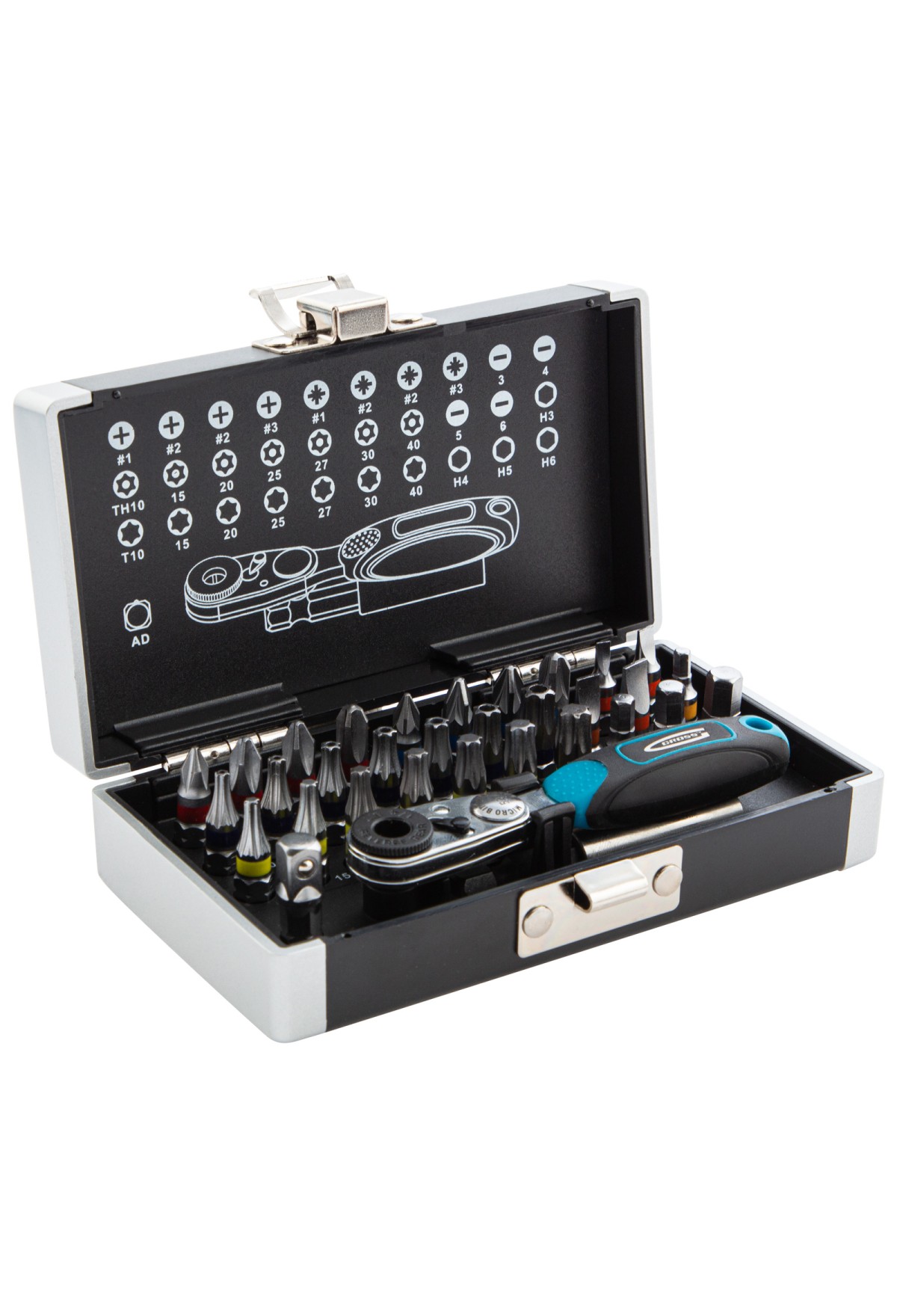 • Быстрый подбор нужной насадки — на крышке кейса напечатана схема комплекта по типоразмерам.