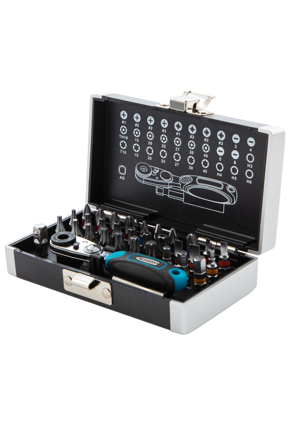 Набор бит с магнитным держателем Gross 11365 с присоединительным размером 1/4 дюйма, 33 предмета из стали S2 в пластиковом кейсе, предназначен для сборки мебели, велосипедов, бытовых приборов, для технического обслуживания автомобилей и прочих монтажных, строительных и слесарных работ. В комплекте подобраны 30 бит самых ходовых типоразмеров, компактный ключ-трещотка с 52 зубьями, магнитный адаптер для бит, а также переходник для использования торцевых головок.