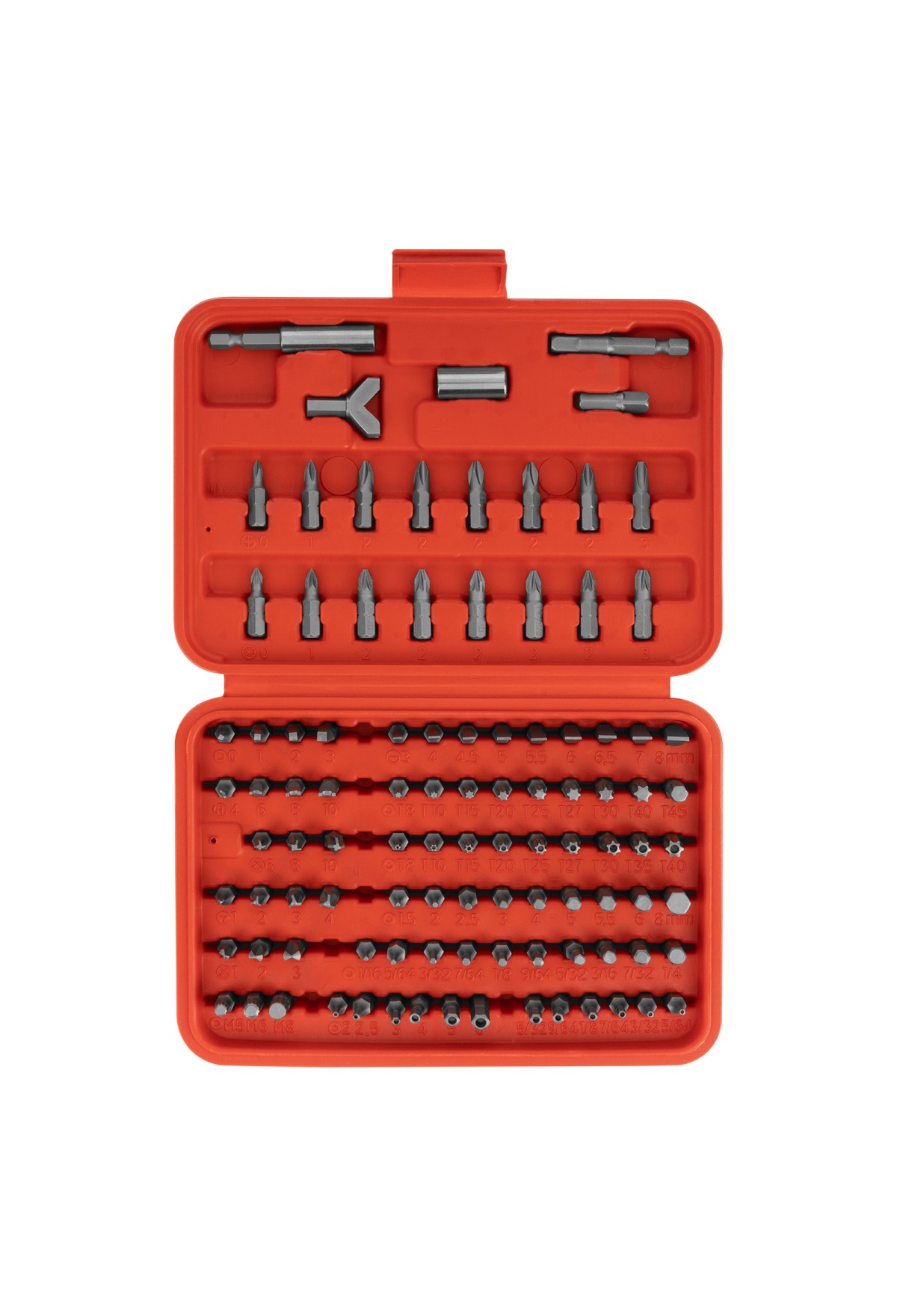 | Комплектация | Пластиковый кейс - 1 штБиты 25 мм: , Philips: РН0, РН1, РН2 (5 шт), РН3, Pozidrive: PZ0, PZ1, PZ2 (5 шт), PZ3, , Slotted: SL3, SL4, SL45, SL5, SL55, SL6, SL65, SL7, SL8, , Torx: T8, T10, T15, T20, T25, T27, T30, T40, T45, , Torx Tamper: TT8, TT10, TT15 |