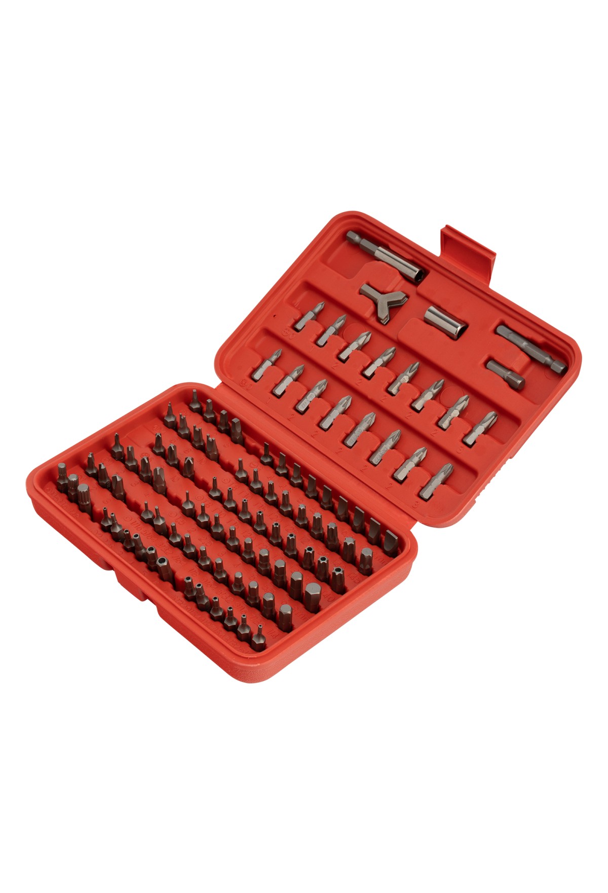 | Комплектация | Пластиковый кейс - 1 штБиты 25 мм: , Philips: РН0, РН1, РН2 (5 шт), РН3, Pozidrive: PZ0, PZ1, PZ2 (5 шт), PZ3, , Slotted: SL3, SL4, SL45, SL5, SL55, SL6, SL65, SL7, SL8, , Torx: T8, T10, T15, T20, T25, T27, T30, T40, T45, , Torx Tamper: TT8, TT10, TT15 |