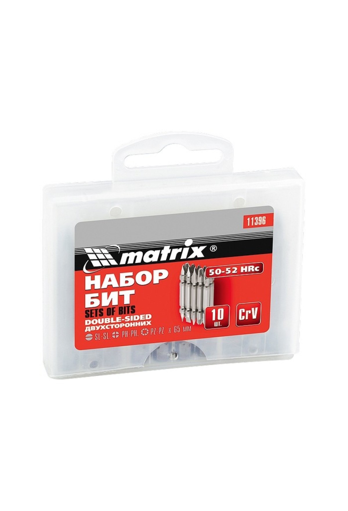 Технические характеристики Набор бит двухсторонних 65 мм, SL-SL, PH-PH, PZ-PZ, 45Х, 10 шт. Matrix