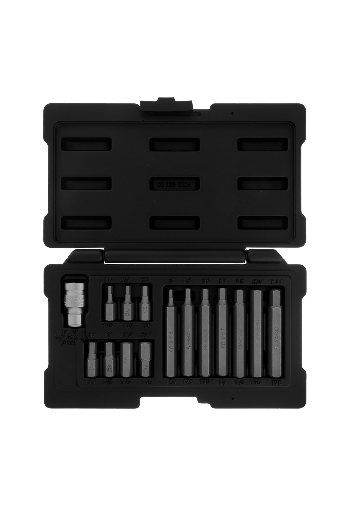 Набор Stels 11313 включает 15 предметов: 14 бит HEX с шестигранным хвостовиком 1/2 дюйма, из стали CrV, и переходник. Переходник позволяет устанавливать биты на ключ-трещотку, пневмогайковерт или пневмотрещотку для монтажа и демонтажа евровинтов со шлицами HEX H4-H12. Набор предназначен для использования в автомастерских и на производстве автомобилей.
