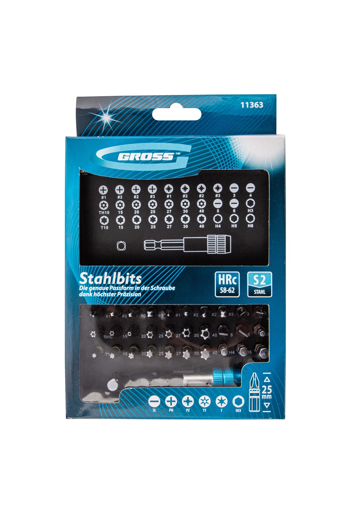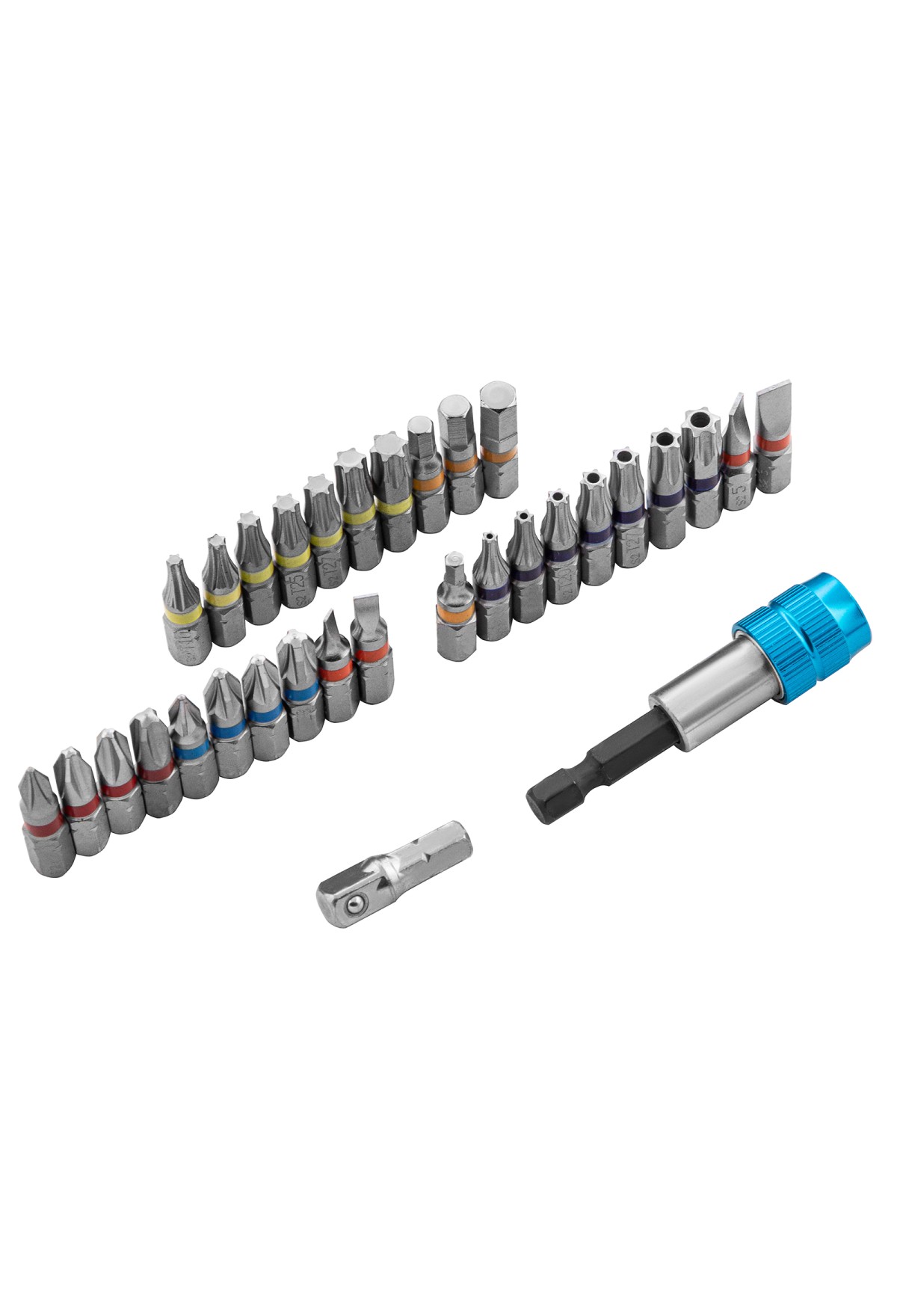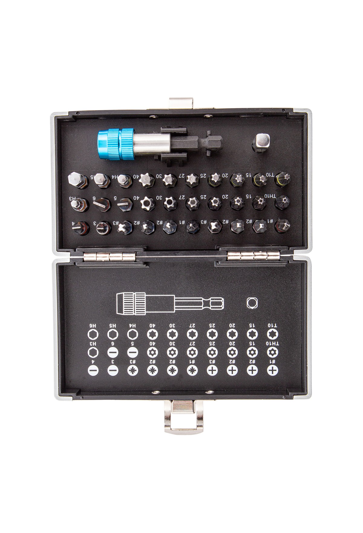 | Комплектация | Пластиковый кейс - 1 штБиты 25 мм: РН1, РН2 (2 шт), РН3, PZ1, PZ2 (2 шт), PZ3, SL3, SL4, SL5, SL6, H3, H4, H5, H6, T10, T15, T20, T25, Т27, Т30, Т40, TТ10, TТ15, TТ20, ТT25, ТТ27, ТТ30, ТТ40 - 30 штАдаптер для торцевых головок 1/4" - 1 штБитодержатель - 1 шт |