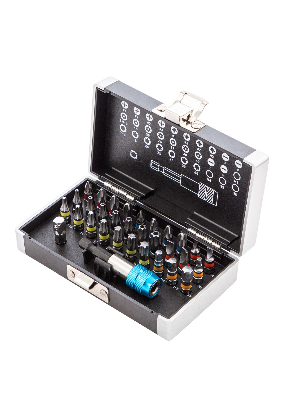 - Широкая комплектация — в одном наборе представлено 6 типов бит: PH и PZ калибров 1-3, SL калибров 3, 4, 5, 6, TORX и TORX Tamper (10, 15, 20, 25, 27, 30, 40), HEX 3-6