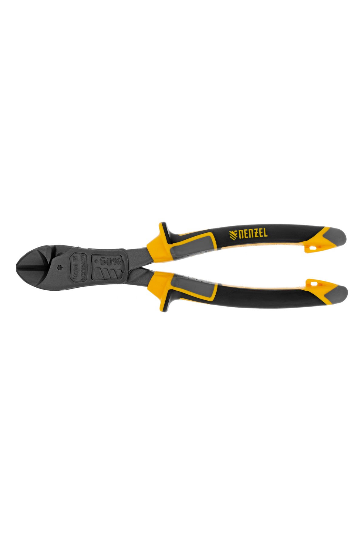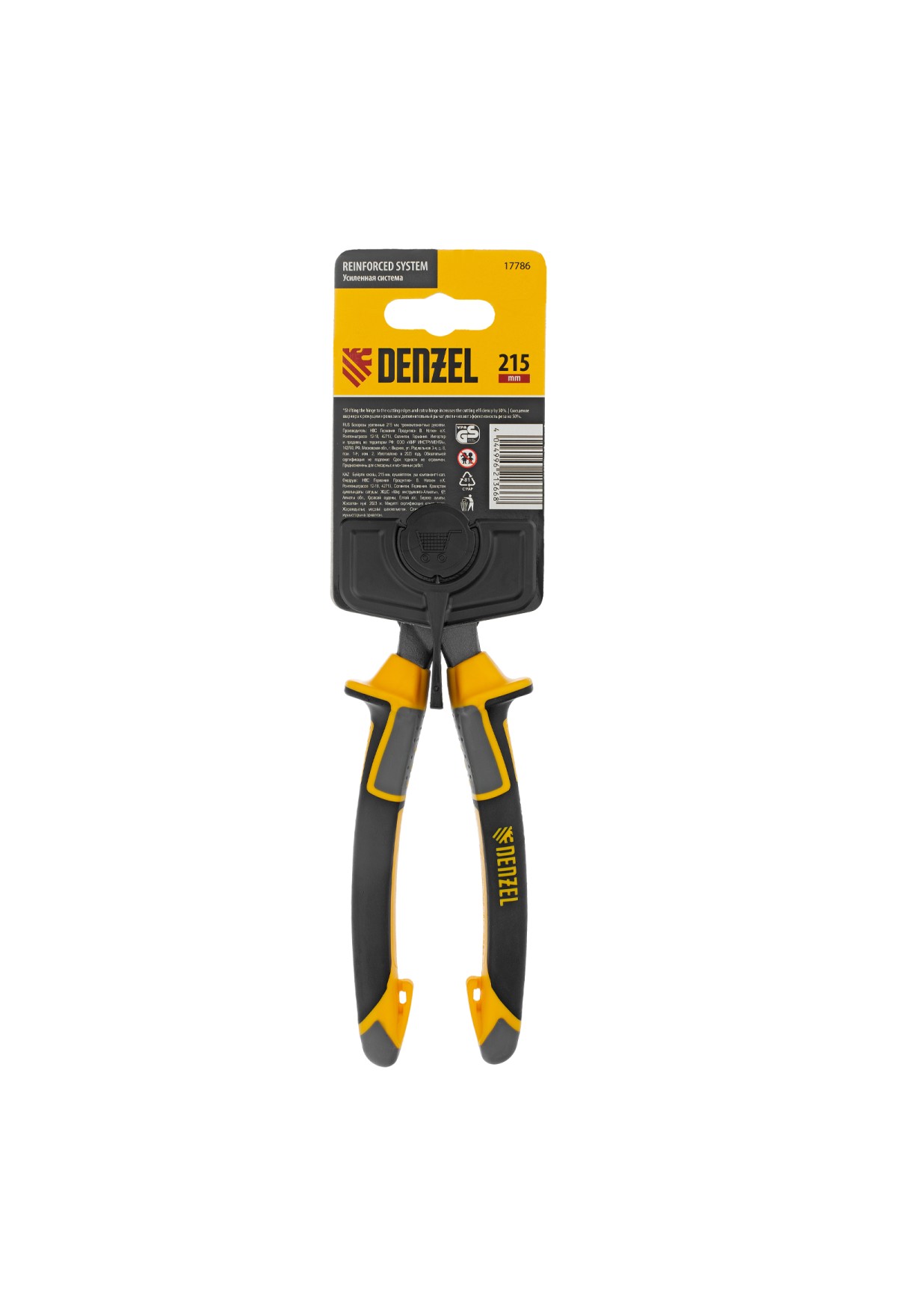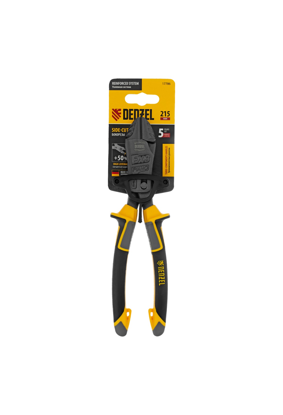 Усиленные бокорезы Denzel 17786 длиной 215 мм, с трехкомпонентными рукоятками, предназначены для разрезания кабелей, проводов, гвоздей и проволоки средней (750 Н/мм2) и высокой жесткости (1800 Н/мм2) диаметром 4,5 и 3,5 мм соответственно. Подходят для резки рояльных струн (предел прочности 2300 Н/мм2) диаметром до 3 мм. Успешно справляются не только с медными, алюминиевыми и пластмассовыми деталями, но и с более жесткими стальными элементами. Встроенный рычажный механизм и смещенный непосредственно к режущим кромкам шарнир увеличивают усилие реза на 50%.