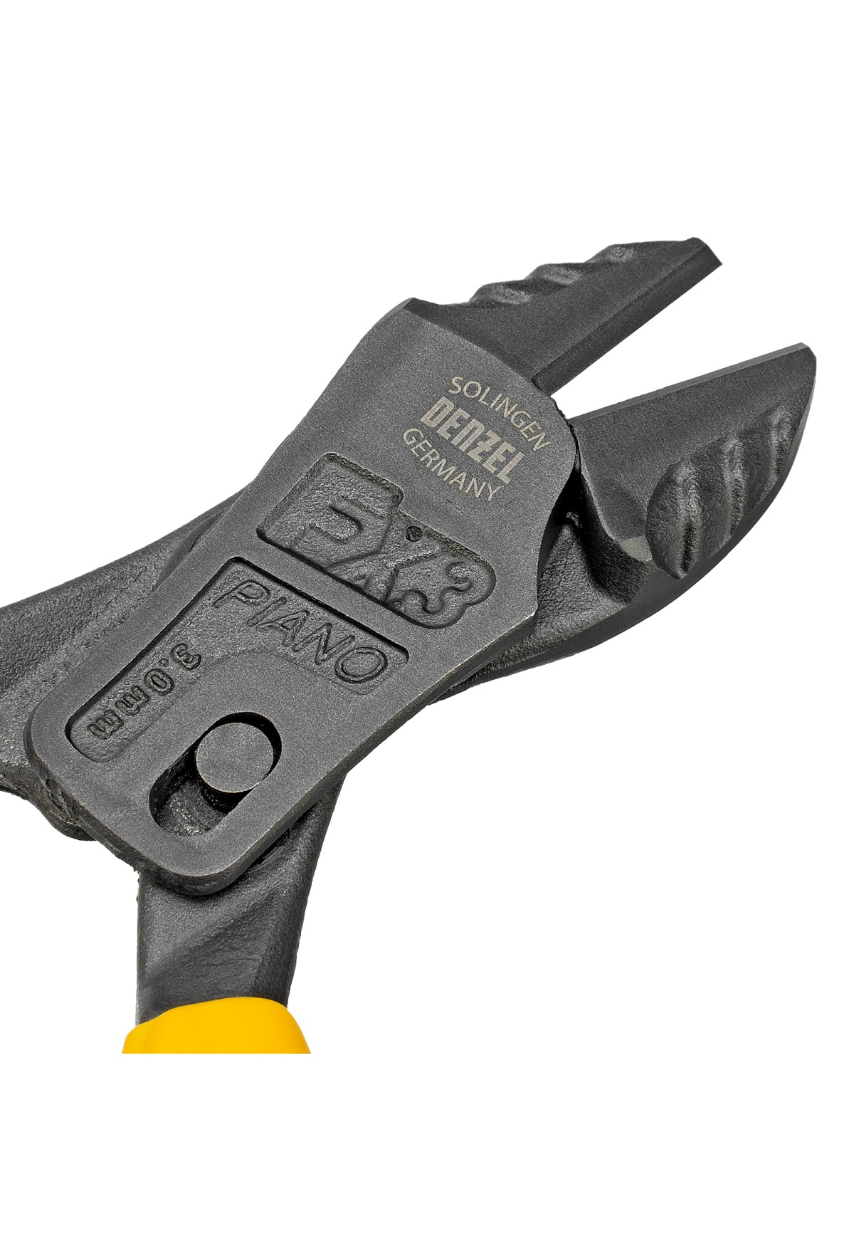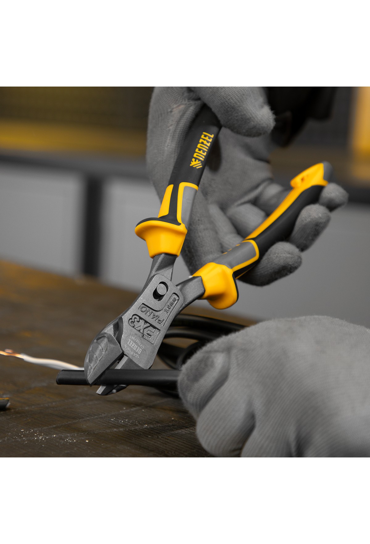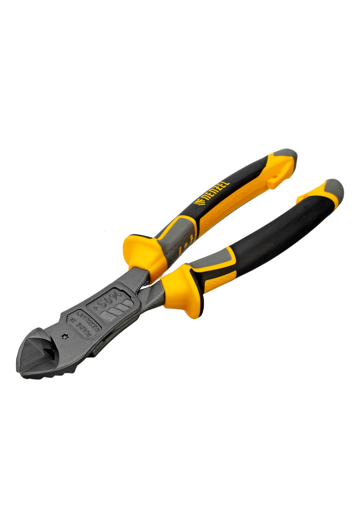 Усиленные бокорезы Denzel 17786 длиной 215 мм, с трехкомпонентными рукоятками, предназначены для разрезания кабелей, проводов, гвоздей и проволоки средней (750 Н/мм2) и высокой жесткости (1800 Н/мм2) диаметром 4,5 и 3,5 мм соответственно. Подходят для резки рояльных струн (предел прочности 2300 Н/мм2) диаметром до 3 мм. Успешно справляются не только с медными, алюминиевыми и пластмассовыми деталями, но и с более жесткими стальными элементами. Встроенный рычажный механизм и смещенный непосредственно к режущим кромкам шарнир увеличивают усилие реза на 50%.