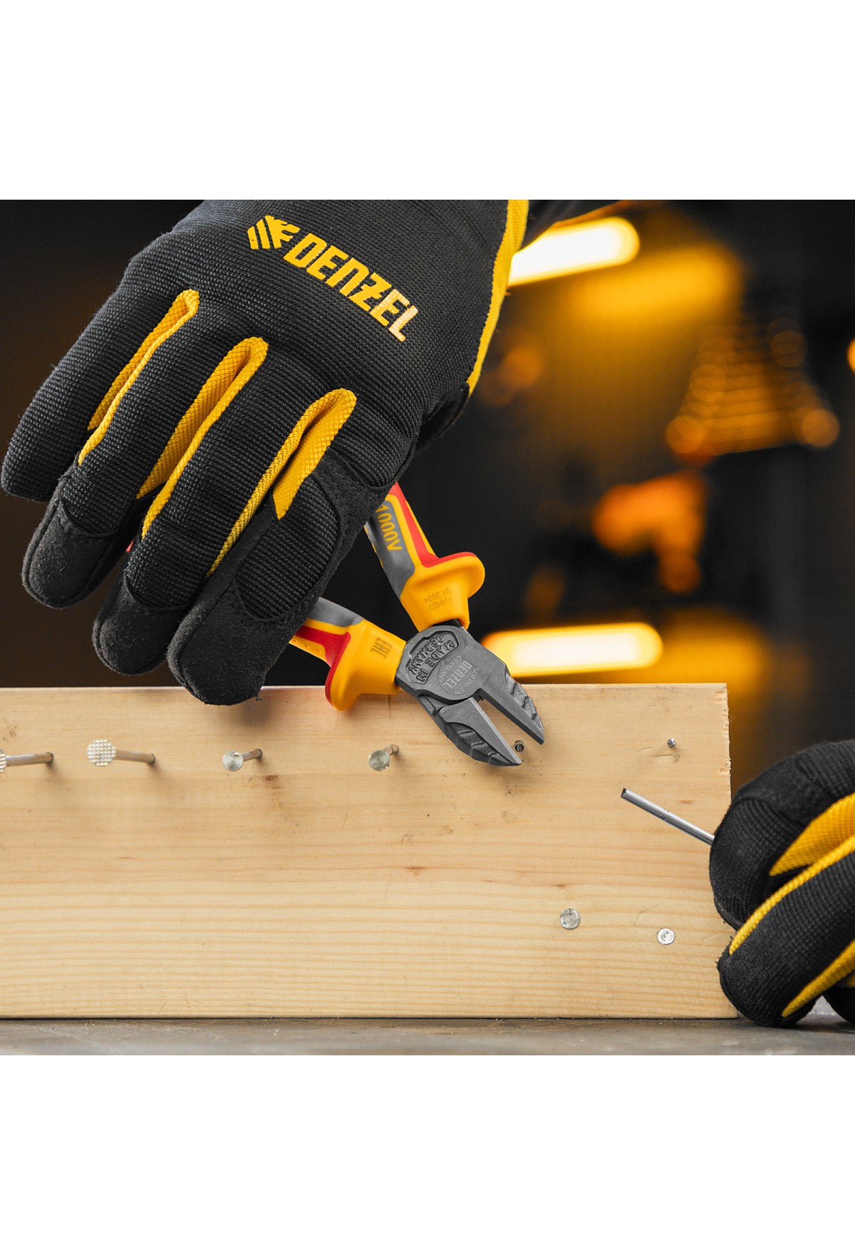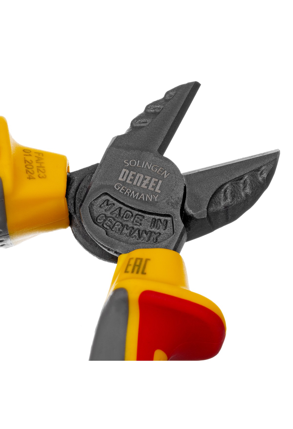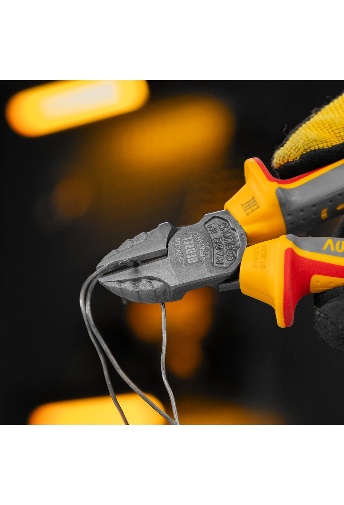 Бокорезы Denzel 17788 длиной 160 мм, с трехкомпонентными диэлектрическими рукоятками, рассчитанными на напряжение до 1000 В, предназначены для разрезания кабелей, проводов, проволоки, стержней из пластмассы и металла. Максимальный диаметр перерезаемой мягкой проволоки (алюминиевой, медной, с пределом прочности 220 Н/мм2) составляет 6 мм, проволоки средней жесткости и гвоздей (750 Н/мм2) — 3,5 мм, жесткой (1800 Н/мм2) — 2 мм. Бокорезы подходят для проведения электромонтажных работ. Инструмент эффективно справляется с поставленными задачами благодаря шарниру, смещенному к режущим кромкам и увеличивающему усилие реза на 20%.
