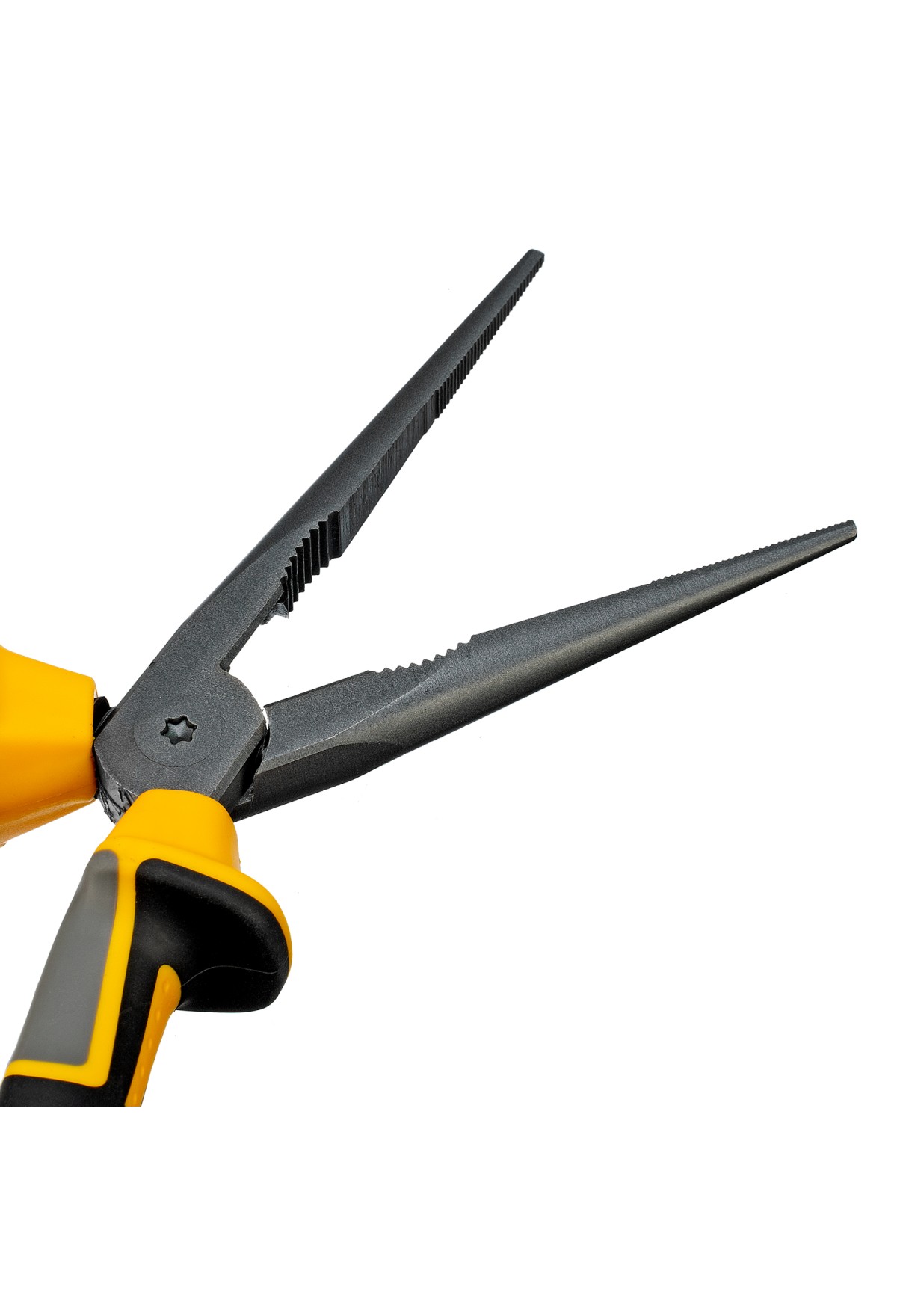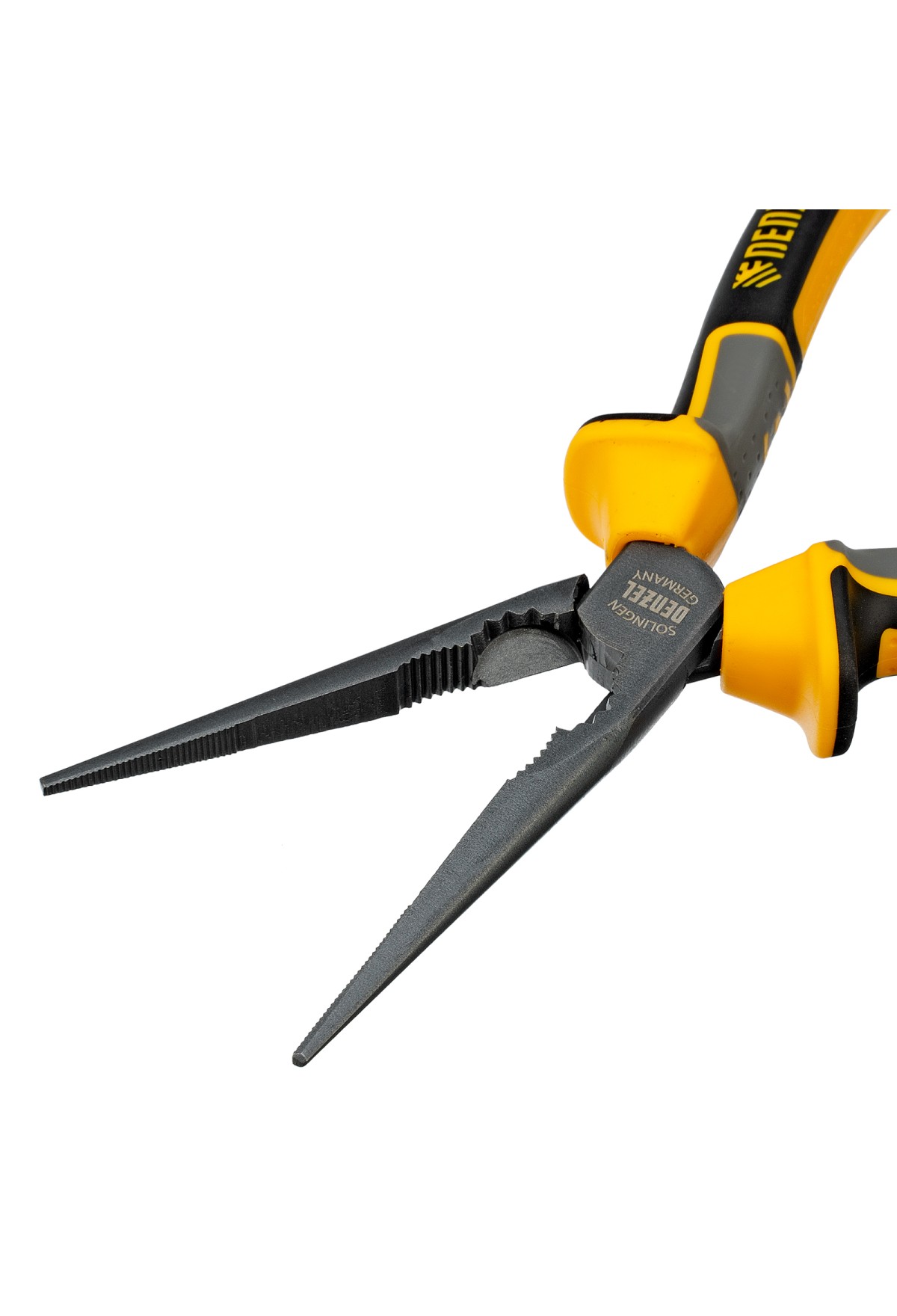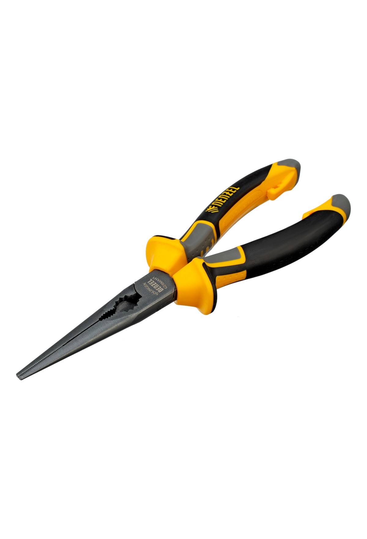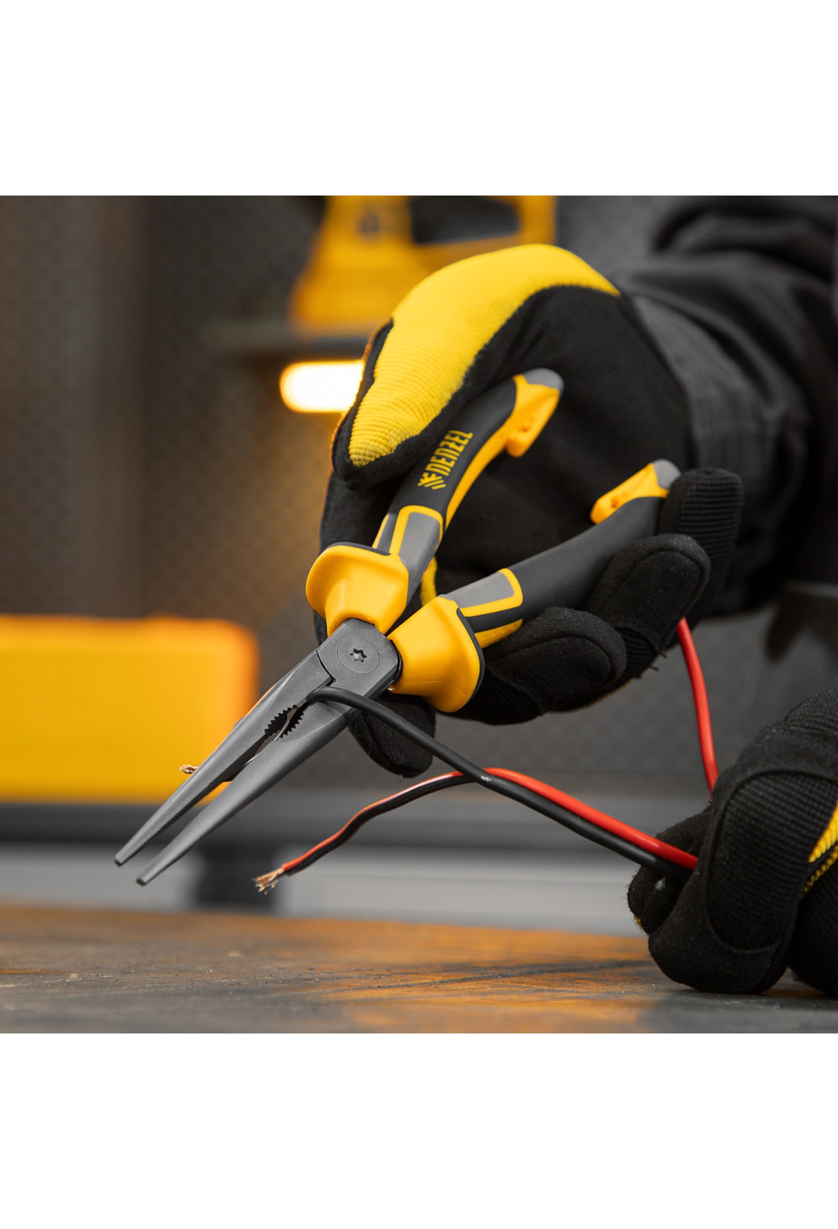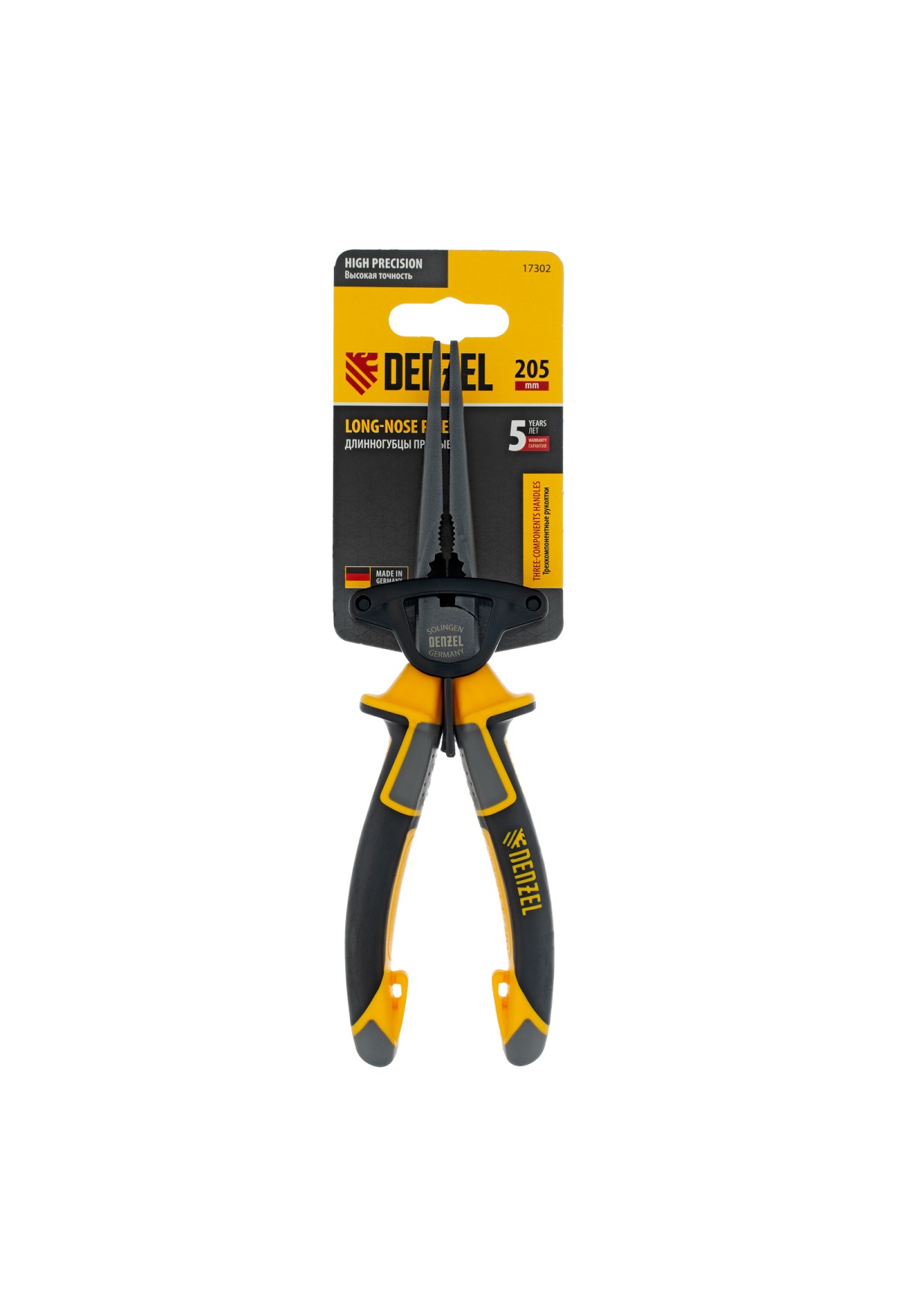 Прямые длинногубцы Denzel 17302 длиной 205 мм, с трехкомпонентными рукоятками, используются для работы с мелкими деталями и крепежом. Позволяют удерживать, сгибать и перекусывать провода или проволоку. Максимальный диаметр перерезаемой мягкой проволоки (алюминиевой, медной, с пределом прочности 220 Н/мм2) составляет 3,9 мм, проволоки средней жесткости и гвоздей (750 Н/мм2) — 3,2 мм, жесткой (1800 Н/мм2) — 2,2 мм. Инструмент оптимален для манипуляций в ограниченном пространстве. Ровные насечки на зажимных частях обеспечивают надежный захват и удержание деталей. Длинногубцы будут полезны во время проведения электромонтажных работ, ремонта оргтехники, техобслуживания автомобиля, пригодятся также в быту.