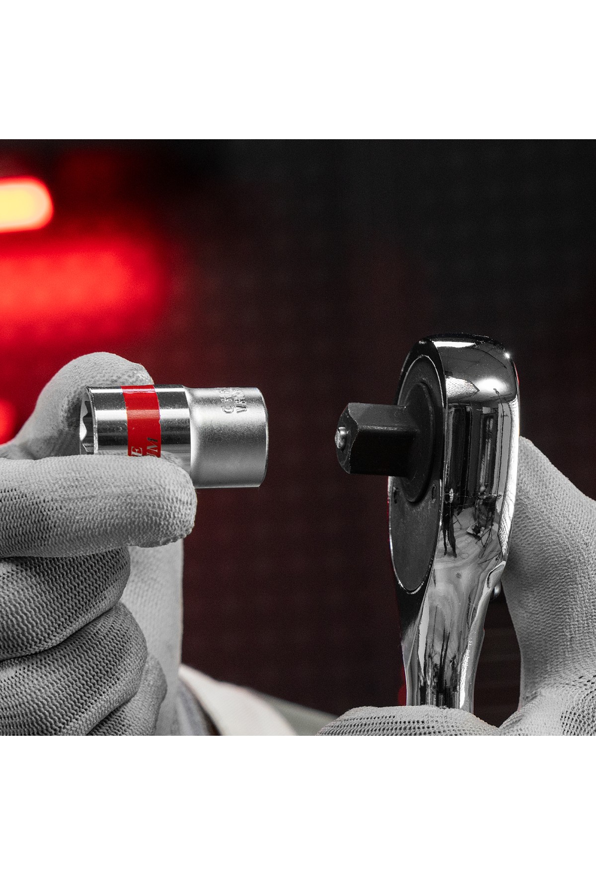 - Удобная работа в тесном пространстве — благодаря 12-гранному профилю головки требуется повернуть инструмент всего на 30° для перестановки.