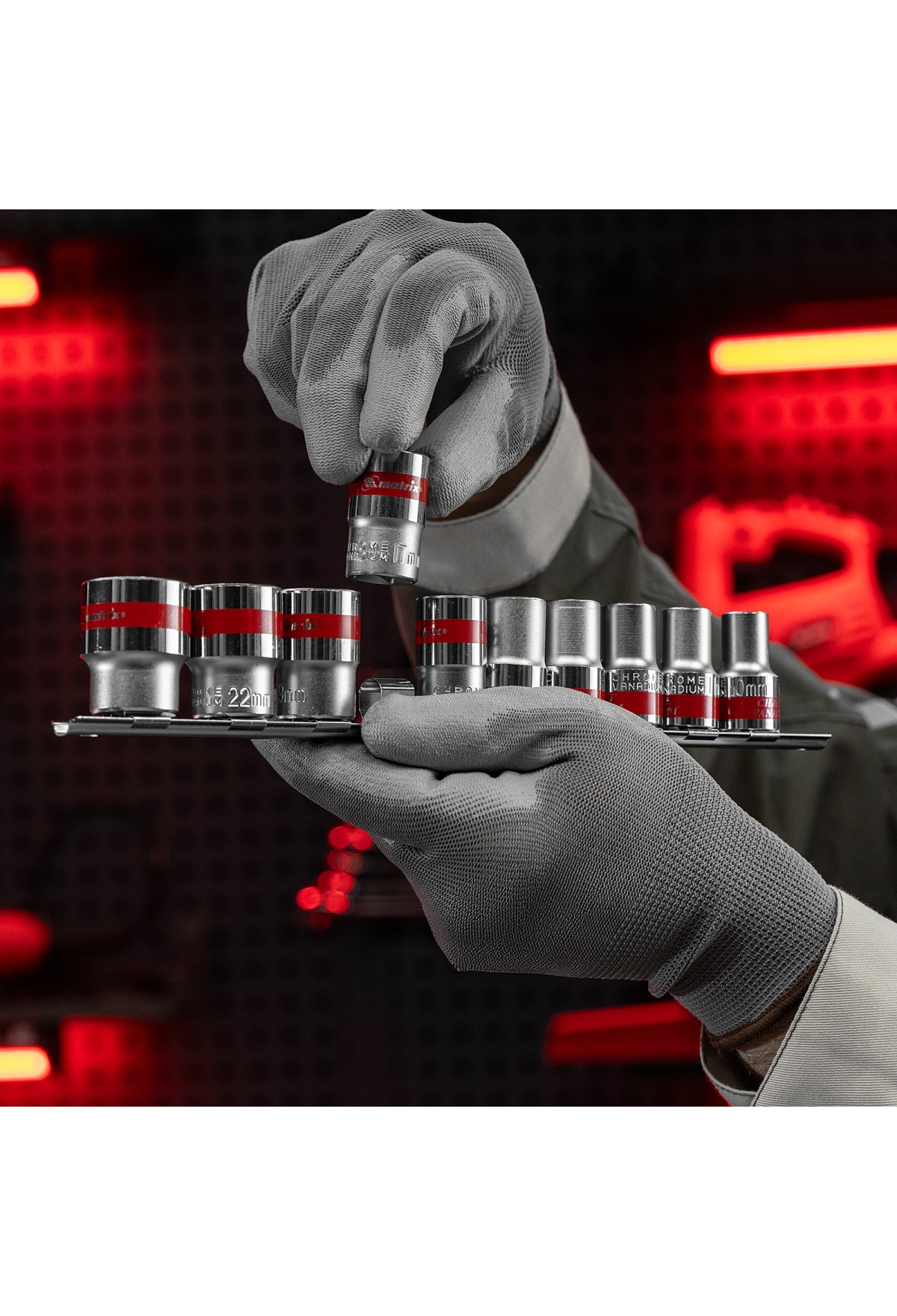 - Быстрый поиск нужной торцевой головки — на корпусах насадок имеются красные полоски и маркировка с обозначением размера.