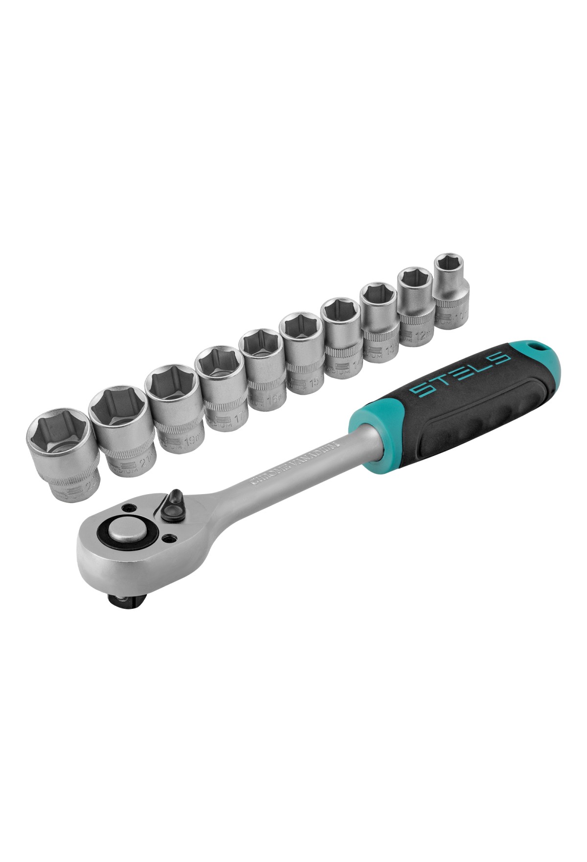 Набор торцевых головок, 1/2", головки 10 - 22 мм, с трещот. ключом, CrV,11 предметов Stels