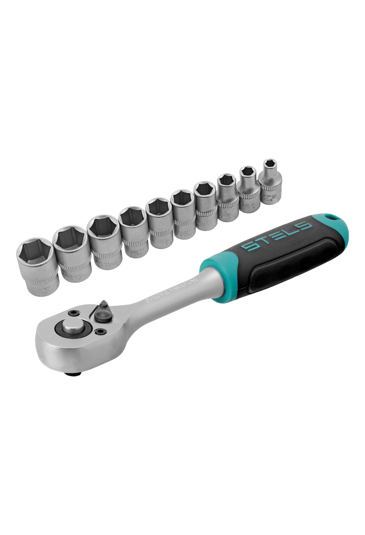 Набор торцевых головок, 1/4", головки 4 - 13 мм, с трещот. ключом, CrV,11 предметов Stels
