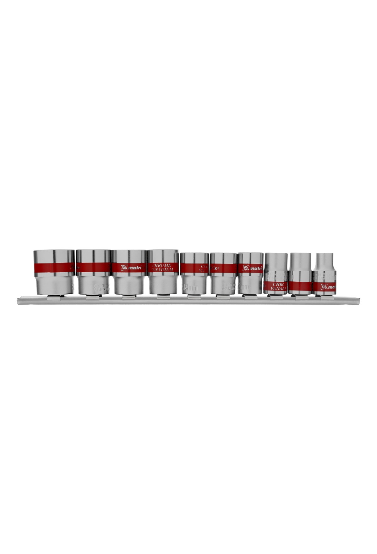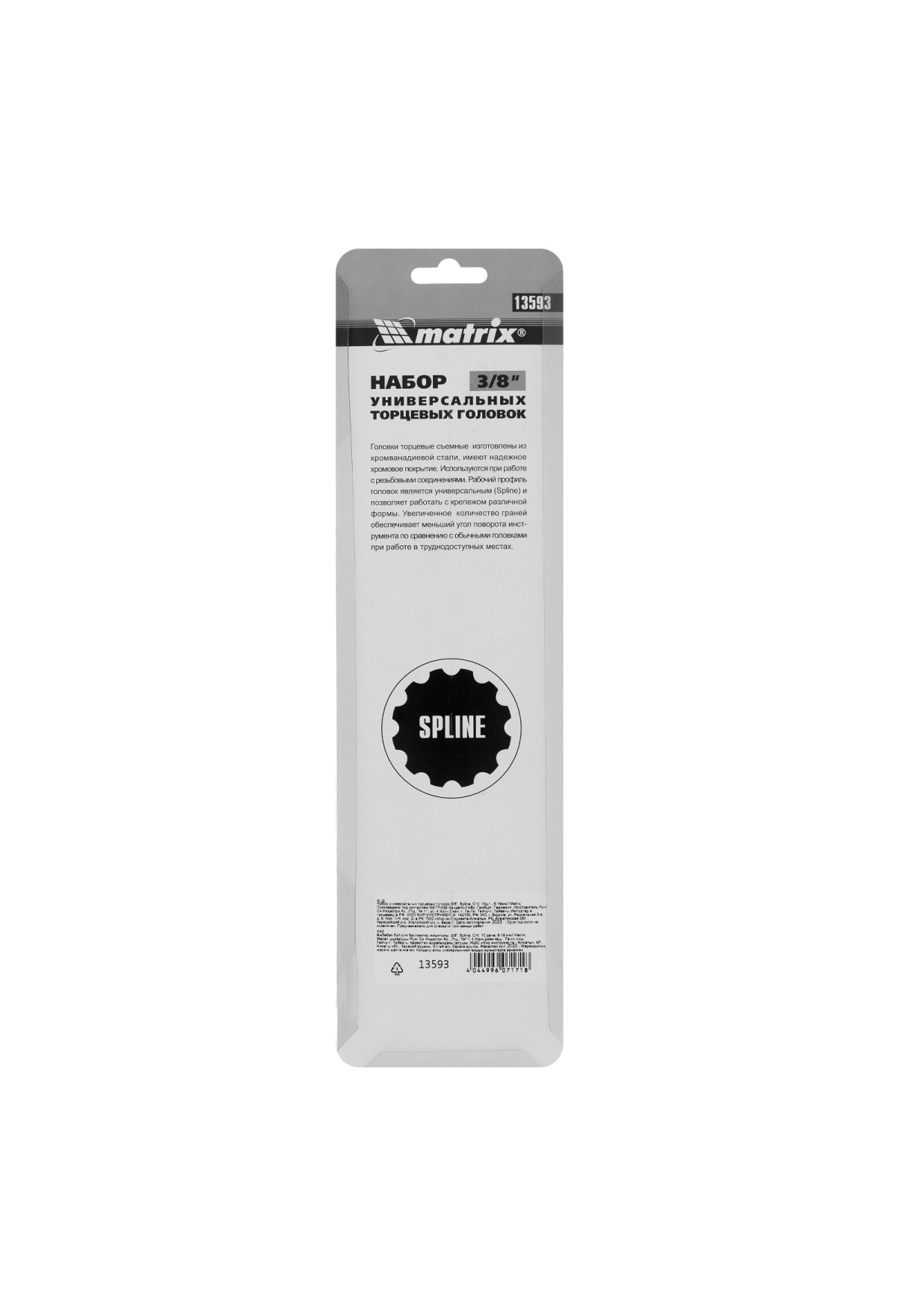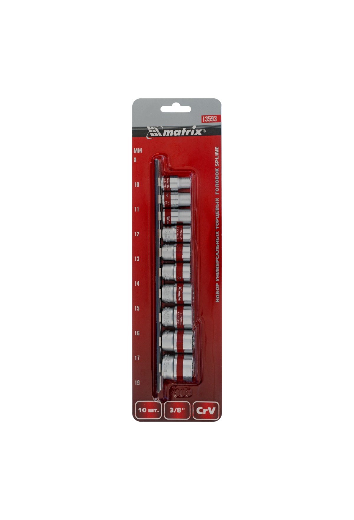 Технические характеристики Набор универсальных торцевых головок 3/8", Spline, CrV, 8-19мм, 10 штук Matrix