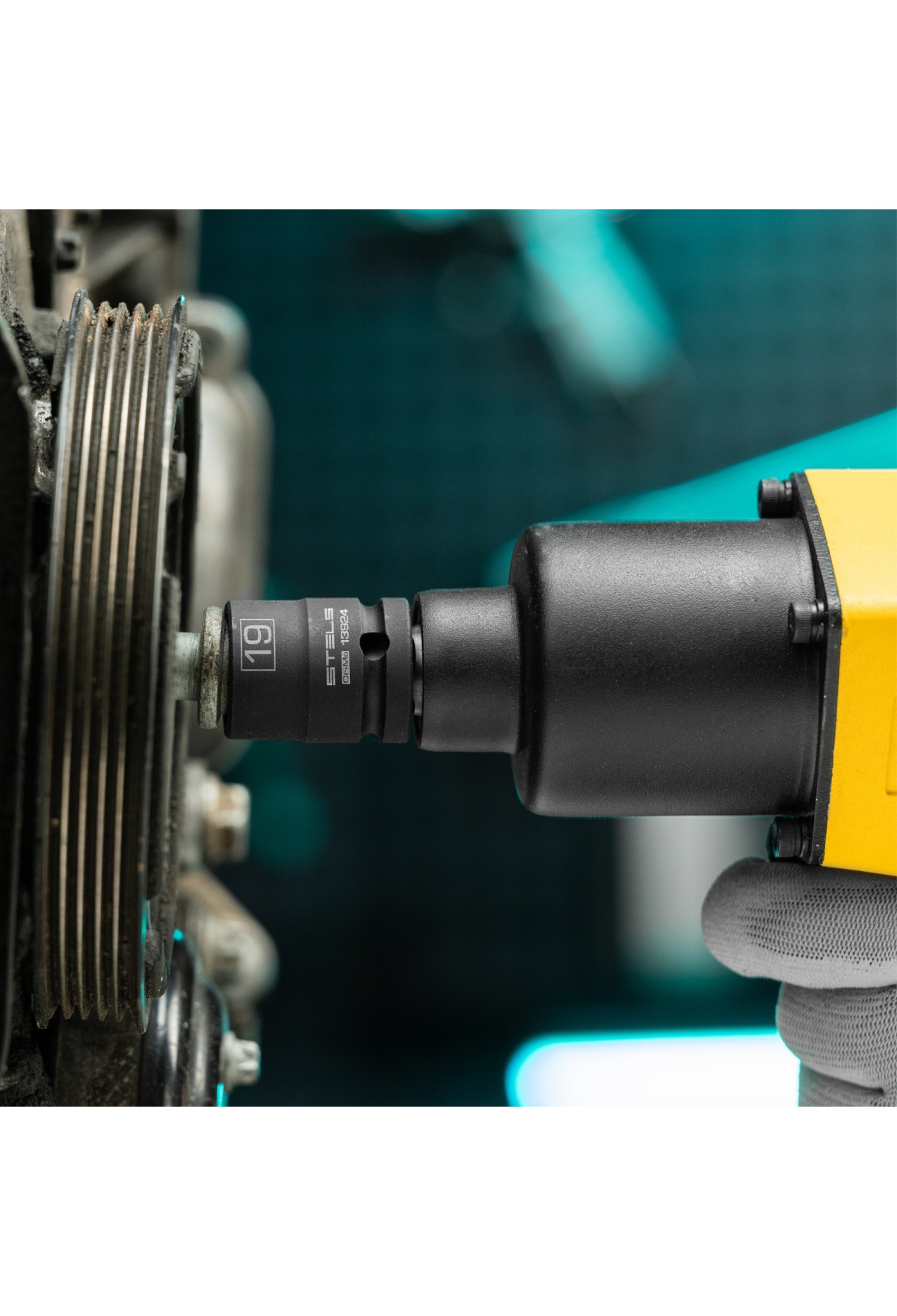 Ударная шестигранная головка Stels 13924 размером 19 мм, из стали CrMo, с присоединительным квадратом 1/2 дюйма, — сменная насадка для электрических и пневматических гайковертов. Она пригодится для монтажа и демонтажа крепежных элементов. Ударная головка выдерживает высокие динамические нагрузки, поэтому подходит для интенсивной эксплуатации на строительной площадке, в автомастерской и слесарном цеху.