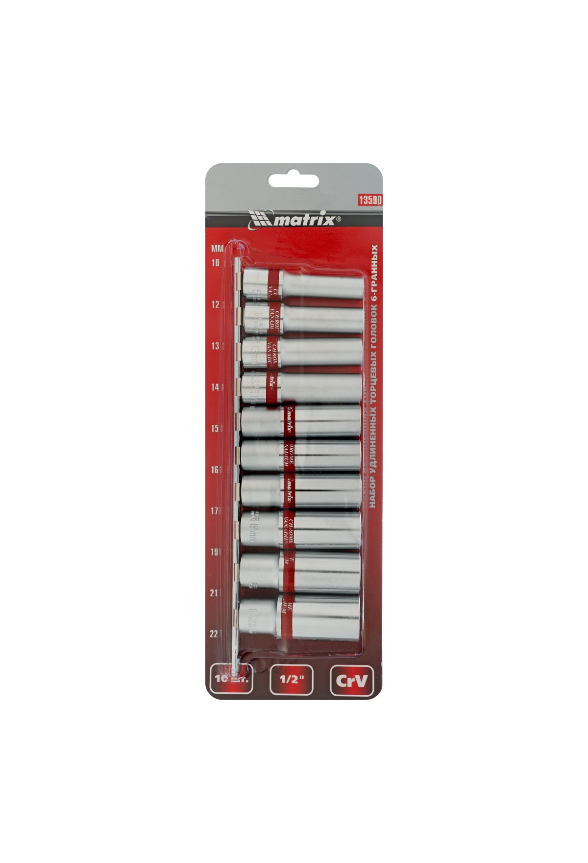 Набор удлиненных торцевых головок Matrix 13590 включает в себя 10 шестигранных насадок 10-22 мм, из стали CrV, с присоединительным квадратом 1/2", предназначенных для работы с резьбовыми соединениями. Торцевые головки с увеличенной длиной применяются для закручивания и откручивания крепежа в труднодоступных местах, а также для извлечения свечей зажигания. Набор востребован у автослесарей, сантехников, а также будет полезен в бытовой сфере.