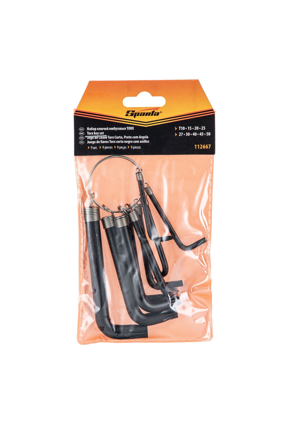 Технические характеристики Набор ключей имбусовых Torx 9 шт: T10, 15, 20, 25, 27, 30, 40, 45, 50, оксидированные, на кольце Sparta