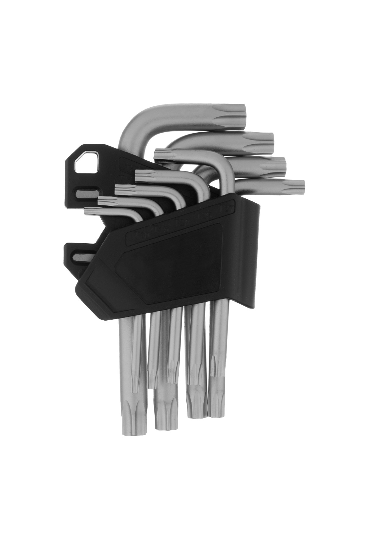 Набор Сибртех 123707 состоит из 9 имбусовых ключей размером TT10-50, из стали CrV, предназначенных для закручивания и откручивания крепежа со шлицем Torx-Tampered. Инструменты пригодятся для ремонта автомобилей, велосипедов, бытовой техники и электроники.