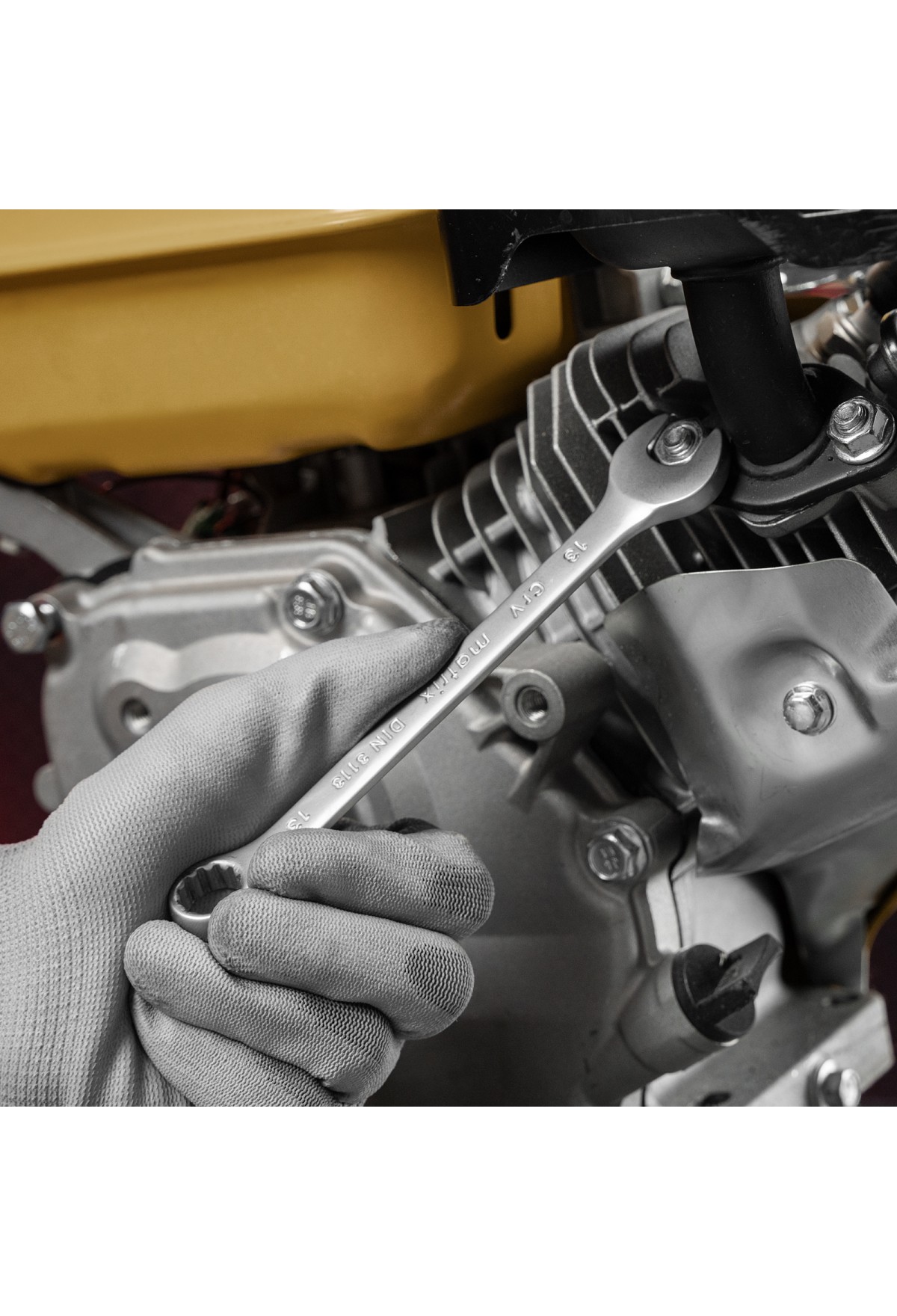 Комбинированный ключ Matrix 15109 размером 13 мм, из стали CrV, с покрытием «матовый хром», пригодится во время ремонтных работ дома или в гараже. С его помощью можно быстро монтировать и демонтировать крепежные элементы. Угол наклона кольцевого зева относительно плоскости инструмента составляет 15°, поэтому ключом удобно работать в труднодоступных местах.