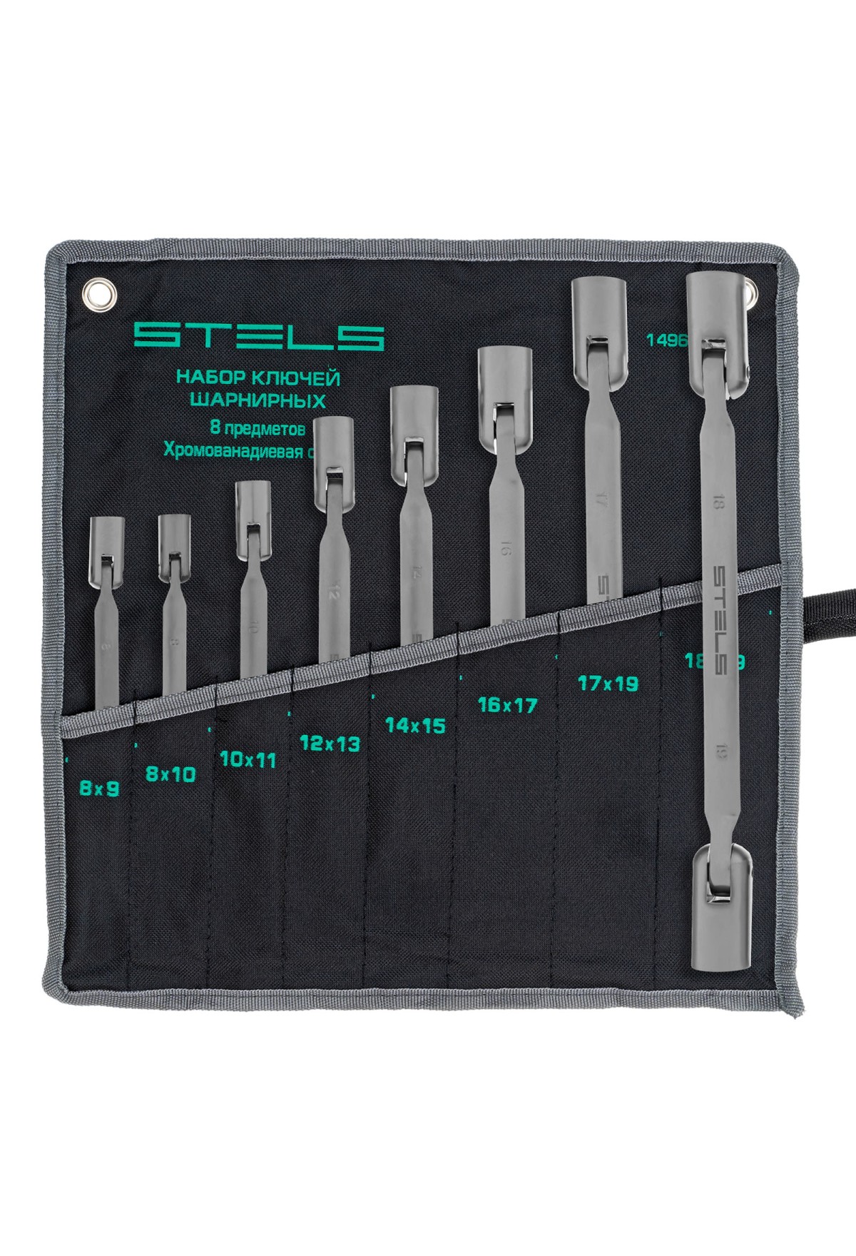 Набор Stels 14965 состоит из 8 шарнирных ключей, изготовленных из стали CrV, с головками размером от 8 до 19 мм, с 12-гранными профилями, и предназначен для работы с болтовыми и гаечными соединениями. Ключи обеспечивают плотный обхват крепежа и удобны для работы в стесненных условиях — величина хода составляет всего 30°. Ключи используются для ремонта автомобилей и других слесарно-монтажных работ.