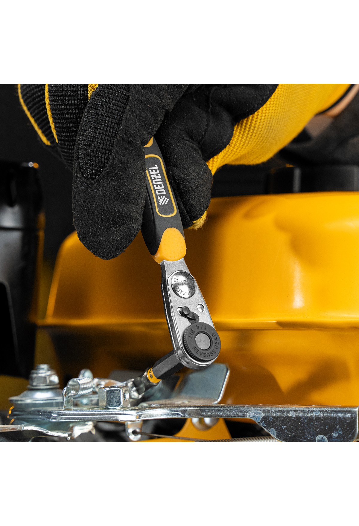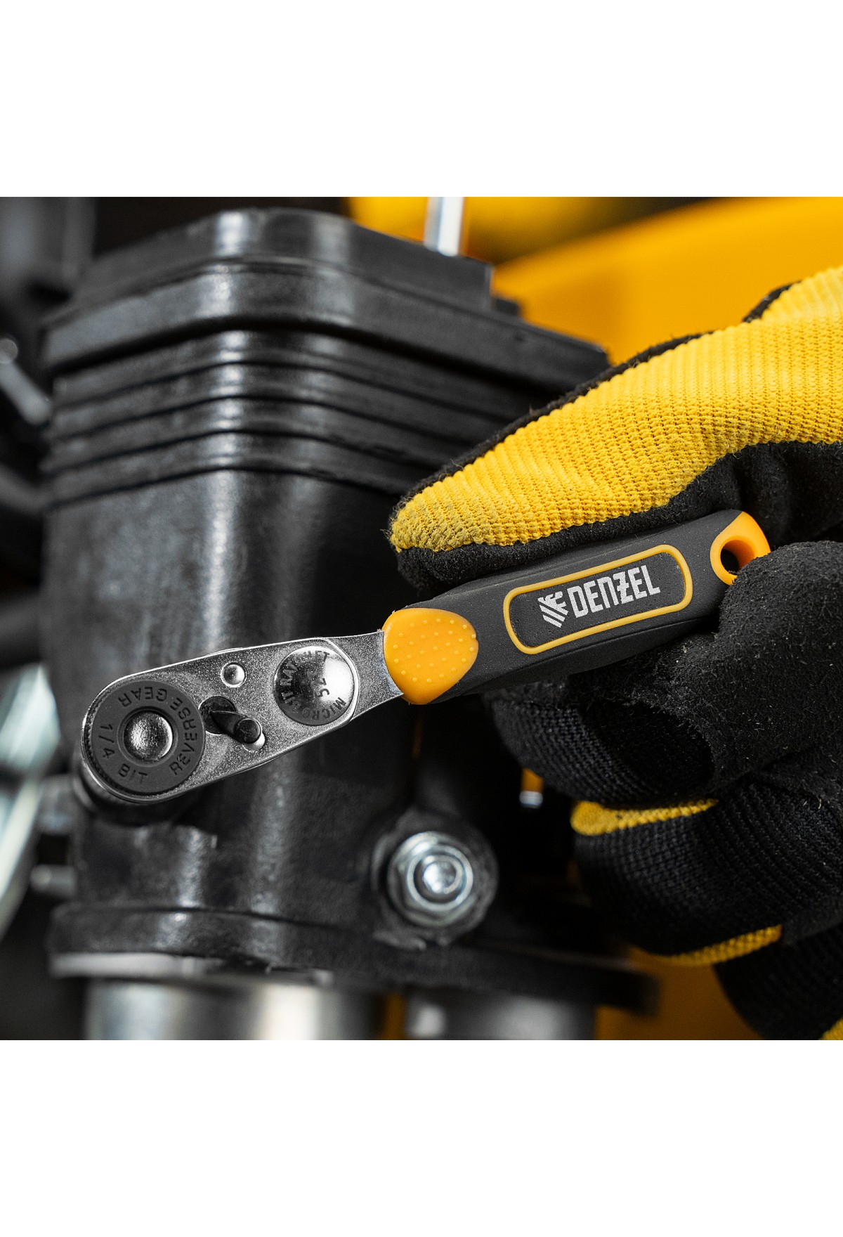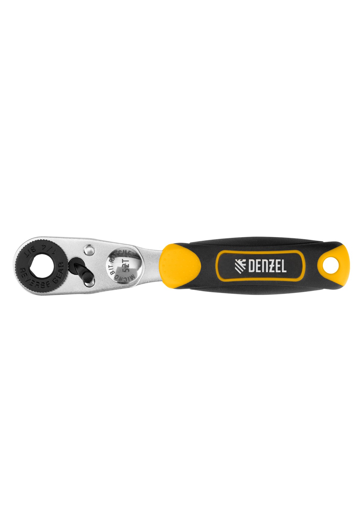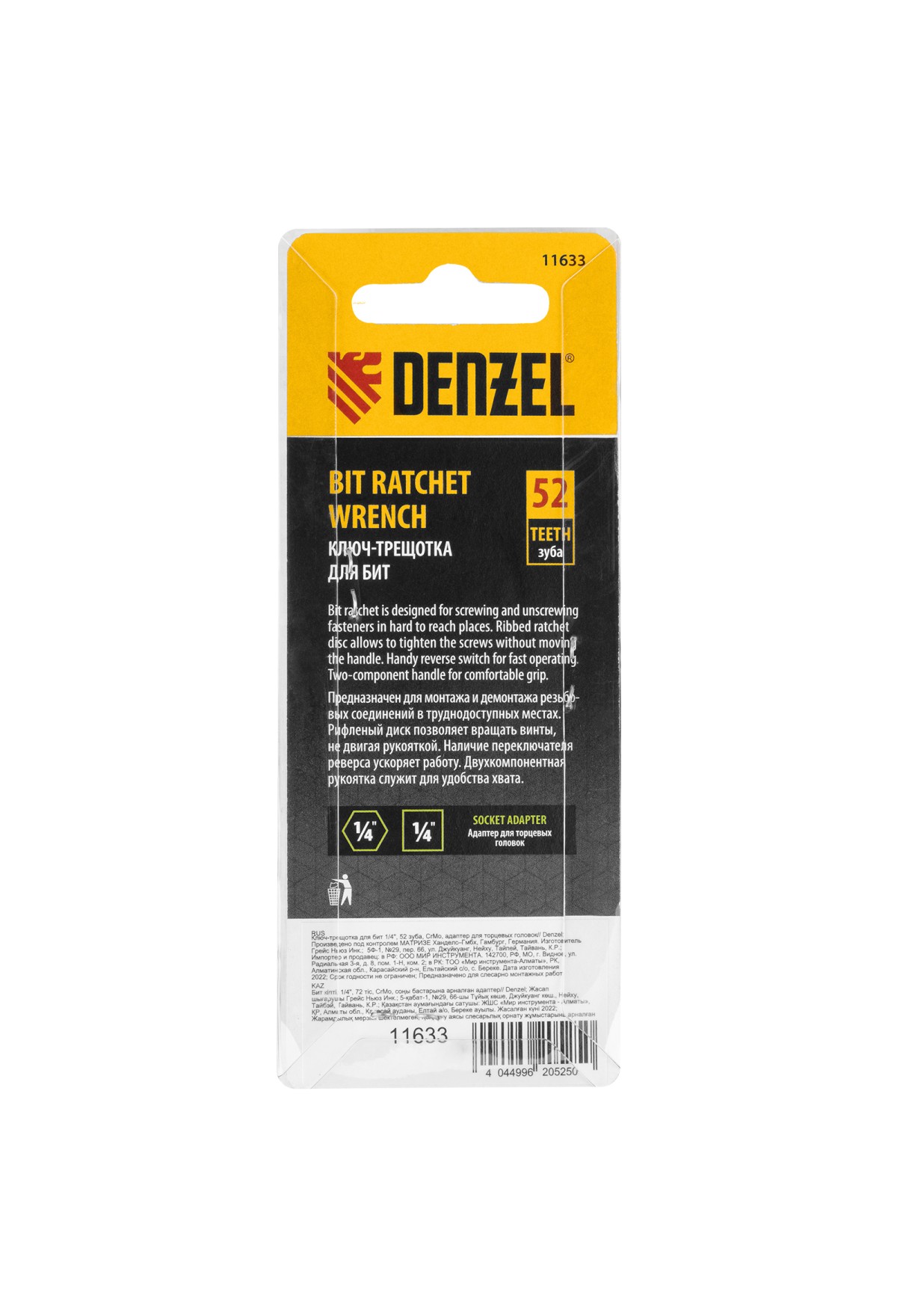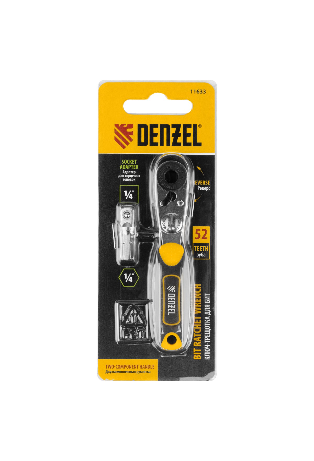 Ключ-трещотка для бит Denzel 11633 с присоединительным размером 1/4 дюйма, из стали CrMo, с адаптером для торцевых головок, предназначен для ремонта техники, сборки и установки оборудования. Благодаря высокому крутящему моменту 40 Нм и стальному храповому механизму с 52 зубьями инструмент обеспечивает легкую и плавную работу с резьбовыми соединениями. Ключ будет полезен в автосервисе, на даче, дома или в гараже.