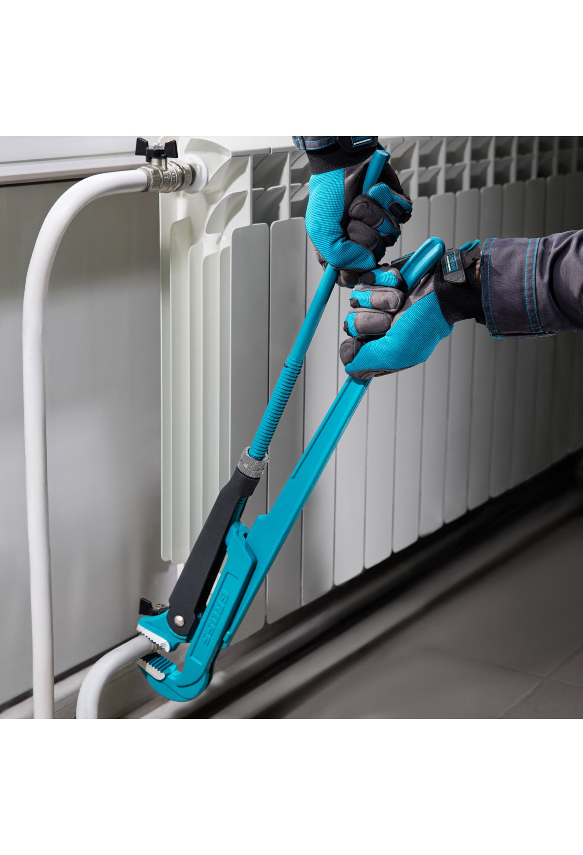 - Самоблокируемый захват труб и деталей — зубья прогрессивной формы наклонены против направления вращения.
