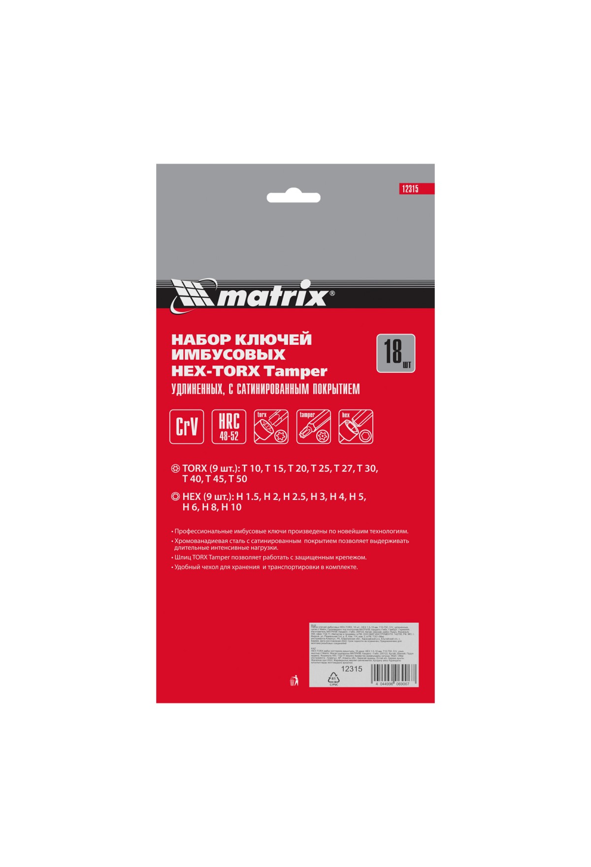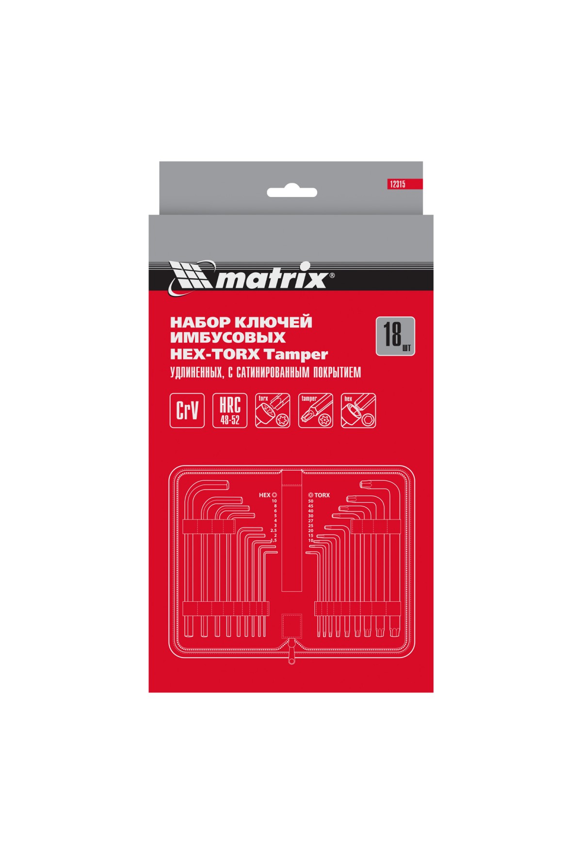 Технические характеристики Набор ключей имбусовых HEX-Torx , 18 шт: HEX 1.5-10 мм, T10-T50, CrV, удлиненных, с сатиновым покрытием Matrix
