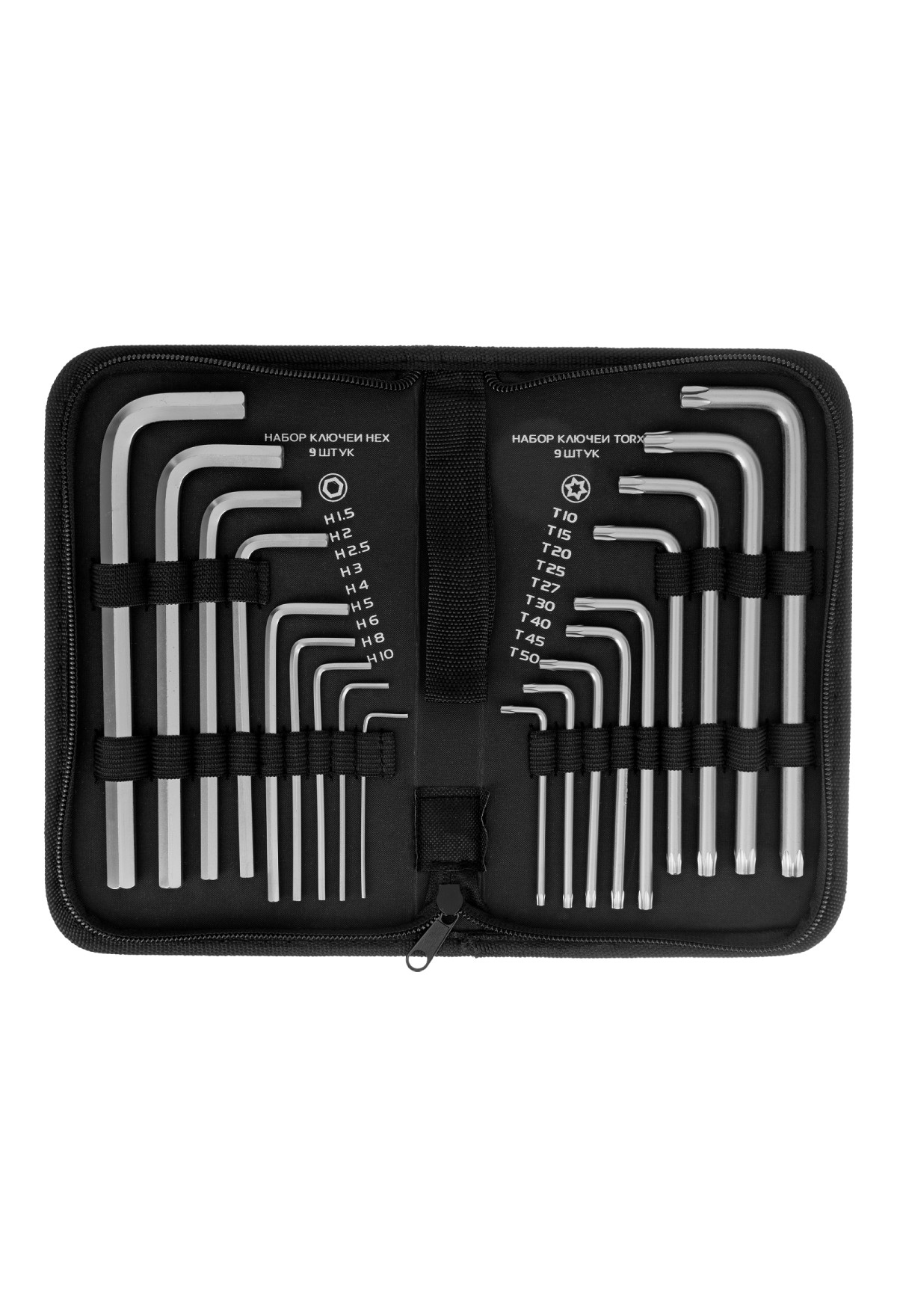 | Комплектация | Нейлоновый чехол - 1 штКлючи имбусовые HEX: 1.5 мм, 2 мм, 2.5 мм, 3 мм, 4 мм, 5 мм, 6 мм, 8 мм, 10 мм - 9 штКлючи имбусовые ТORX Tampered: TТ10, TT15, TT20, TT25, TT27, TT30, TT40, TT45, TT50 - 9 шт |