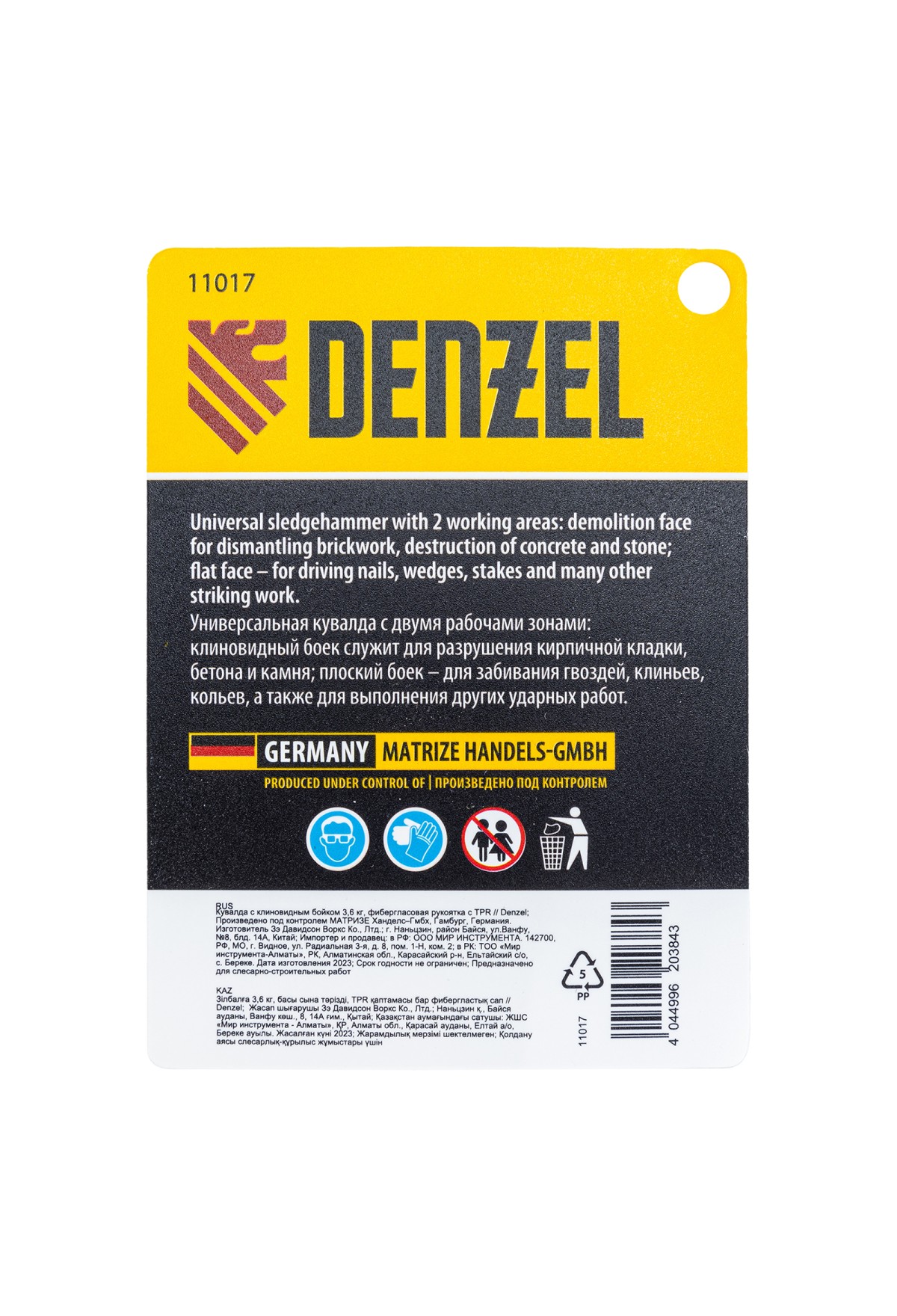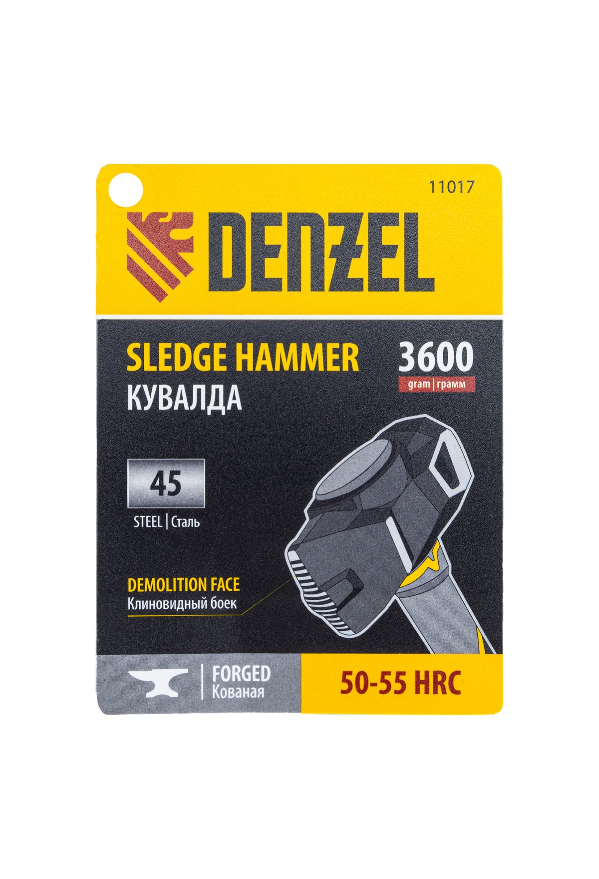 Кувалда Denzel 11017 с клиновидным бойком весом 3,6 кг и фибергласовой рукояткой с TPR-покрытием предназначена для проведения демонтажных работ. Удлиненная рукоятка позволяет наносить удары большой силы. Две рабочие зоны делают инструмент универсальным в работе: клиновидный боек позволяет разрушать кирпичную кладку, конструкции из бетона и камня, а плоский боек — забивать большие гвозди, колья, клинья и выполнять другие ударные работы. Кувалда также подходит для правки автомобильных дисков и проведения сборочных работ. Рекомендована для профессионального применения.