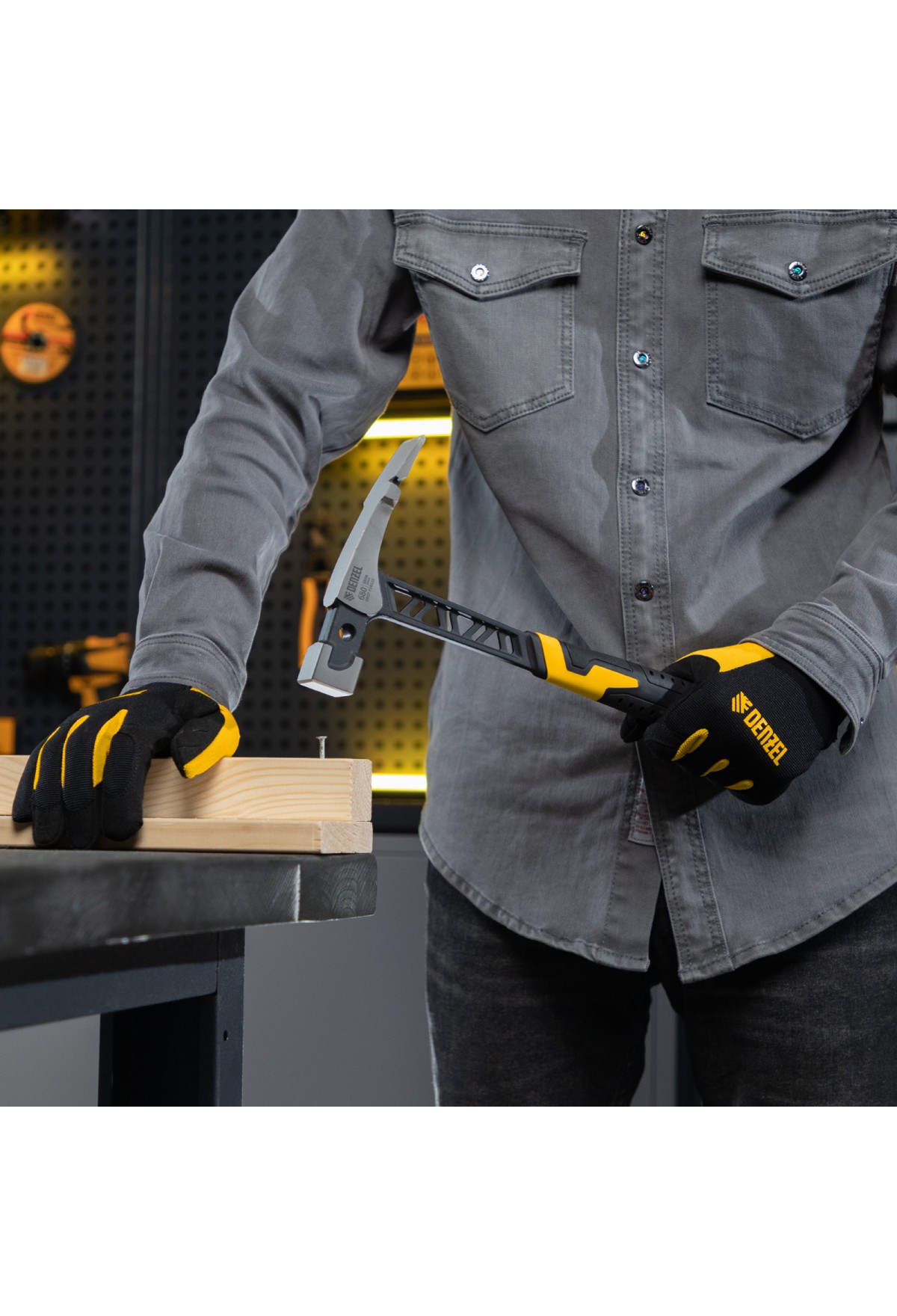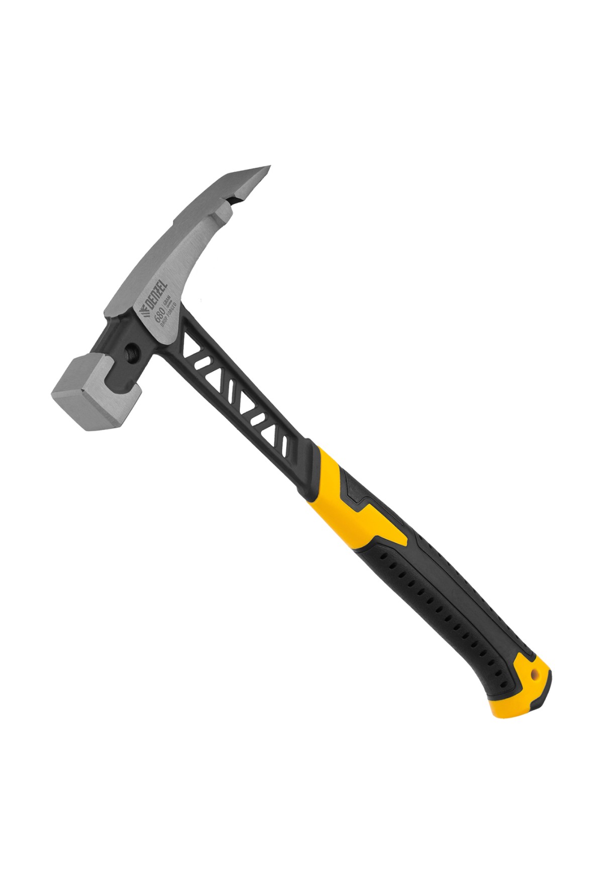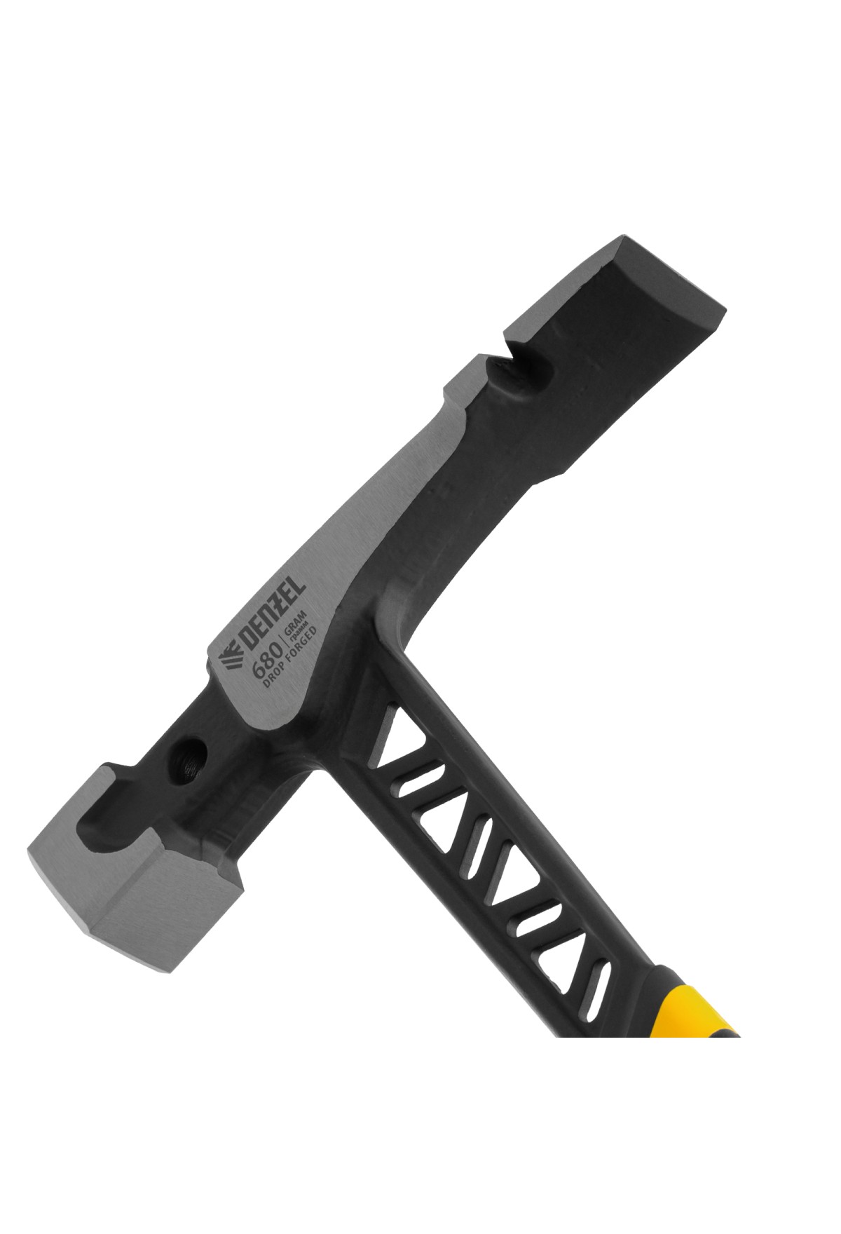 Цельнокованый молоток каменщика Denzel 10633 с бойком весом 680 г, с двухкомпонентной обрезиненной рукояткой, используется для выполнения работ с каменной или кирпичной кладкой. Квадратный боек предназначен для нанесения ударов, а удлиненный заточенный носок — для разрубания камня или кирпича. Гвоздодер применяется для выпрямления небольших гвоздей.