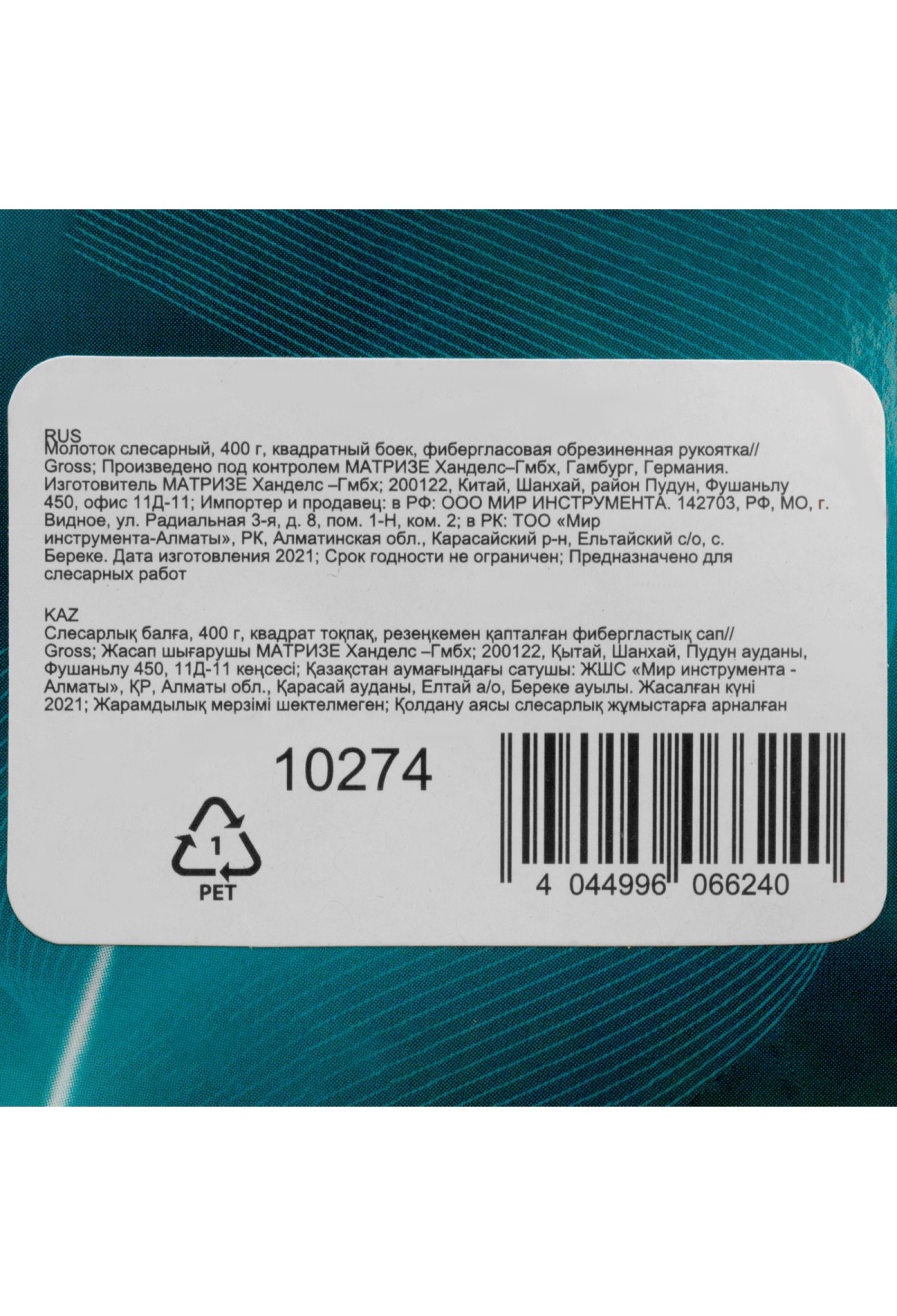 Технические характеристики Молоток слесарный, 400 г, квадратный боек, фибергласовая обрезиненная рукоятка Gross