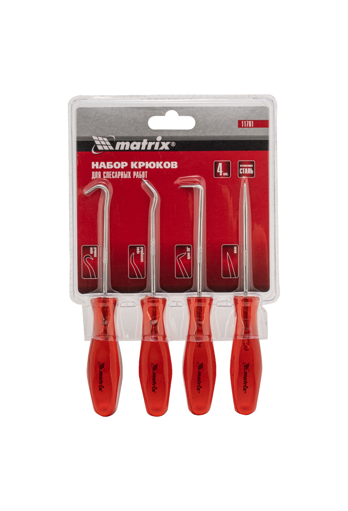 Набор крюков для слесарных работ Matrix 11761 состоит из 4 предметов длиной 155 мм — шила, полного и углового крюков, а также крюка на 90°. Набор позволяет решать разнообразные бытовые и профессиональные задачи: снимать уплотнительные кольца и сальники, размечать металлические детали, проделывать отверстия в коже, дереве и других материалах. Инструменты будут полезны при выполнении строительных, слесарных и столярных работ, пригодятся в автосервисе, а также дома или на даче.