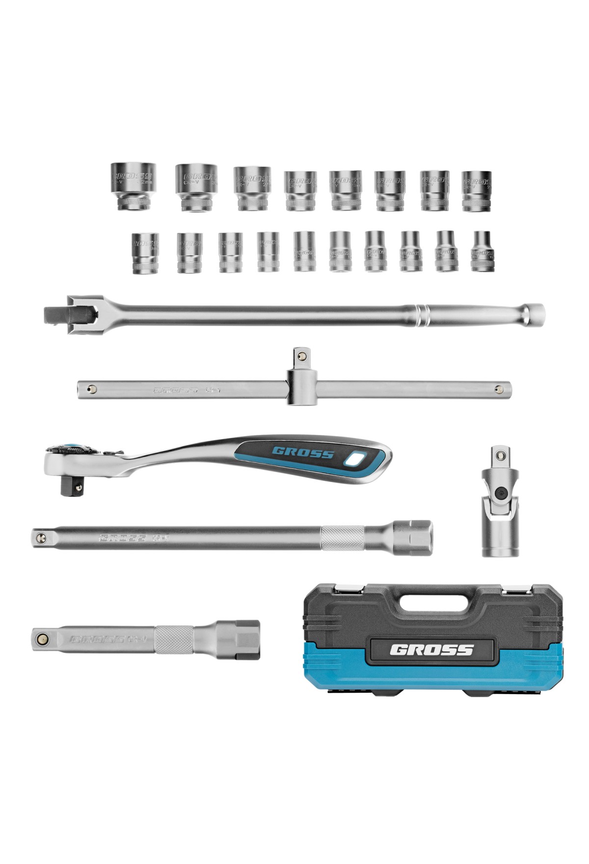 Набор инструментов Gross 14147 из стали CrV используется для закручивания и откручивания резьбового крепежа и включает 24 предмета, в том числе ключ-трещотку со 120 зубьями и присоединительным квадратом 1/2". Комплект адаптирован для работы в труднодоступных местах — для этого предусмотрены удлинители, воротки и карданный шарнир. Набор подойдет для самостоятельного ремонта автомобилей и выполнения бытовых работ.