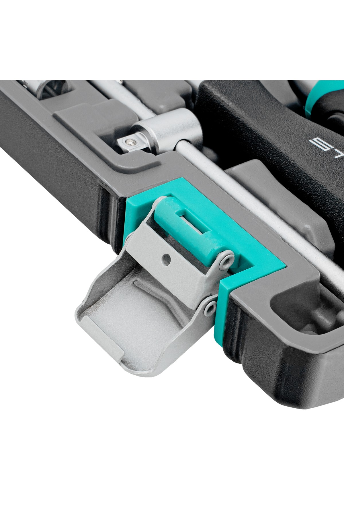 - Быстрый поиск нужного инструмента — элементы набора надежно зафиксированы в ячейках ложемента с подписанными типоразмерами.