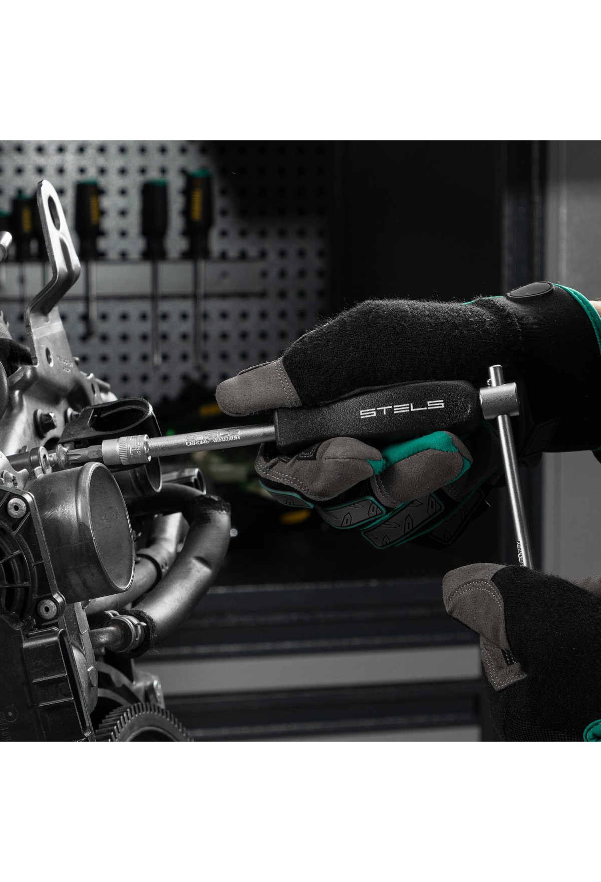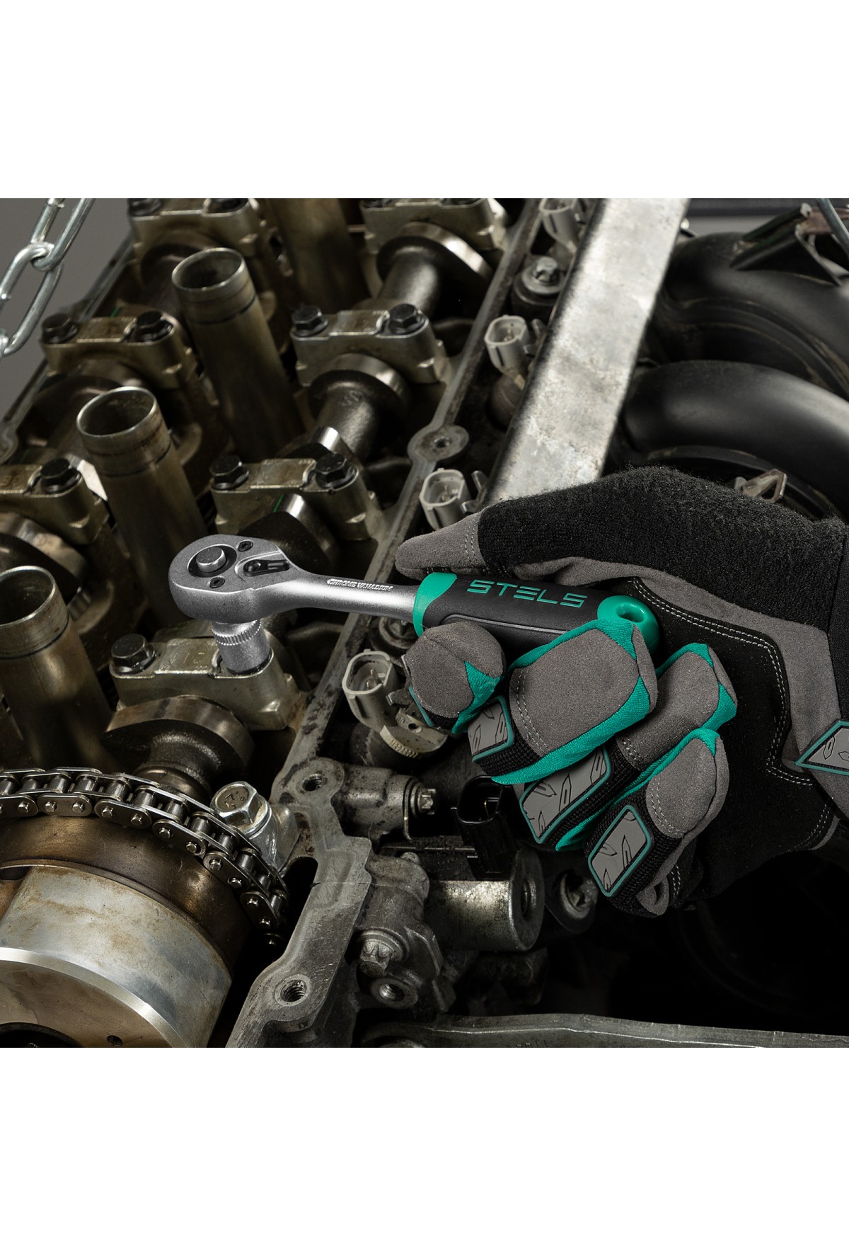 - Защита от разрушения — матовое антикоррозийное покрытие предотвращает появление ржавчины, а рукоятка трещотки из полипропилена и резины устойчива к воздействию бензина и масла.
