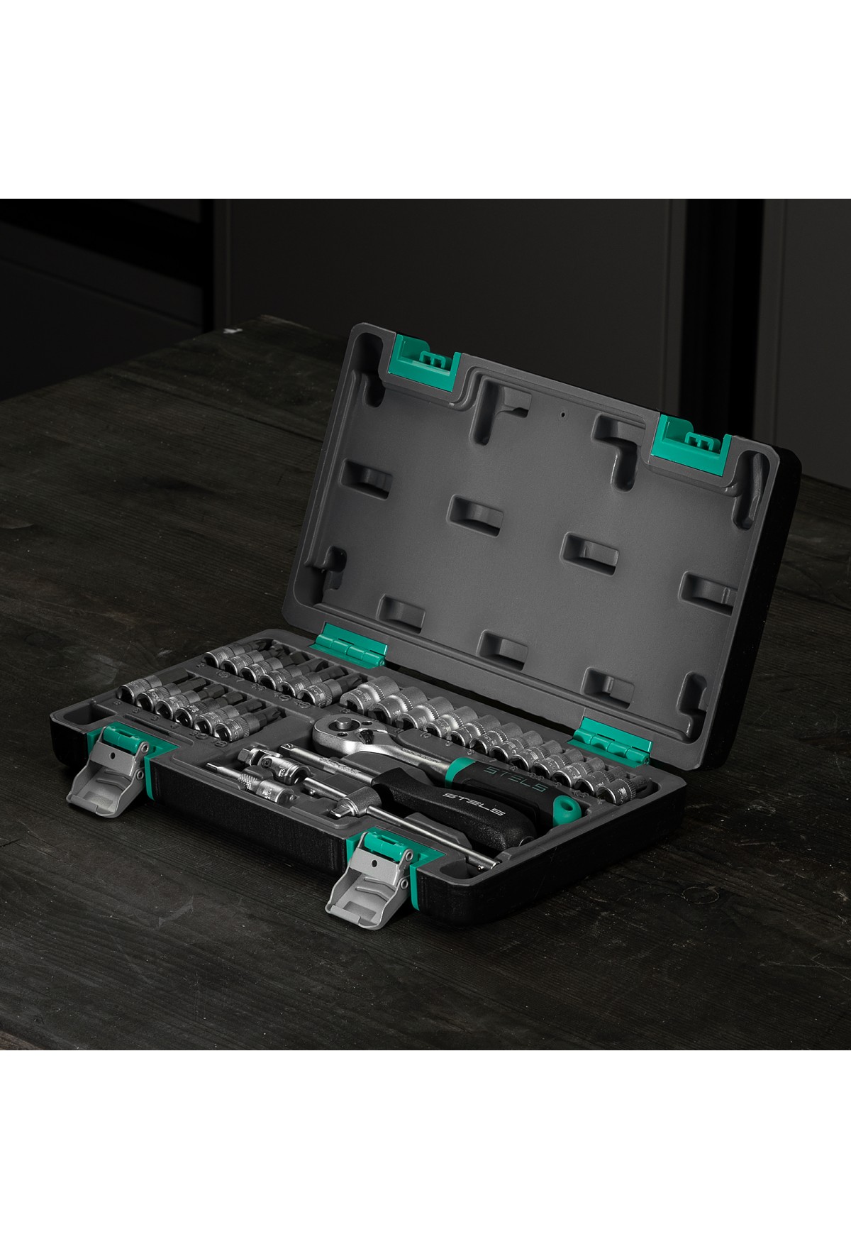 Набор инструментов Stels 14100 в пластиковом кейсе включает в себя 29 предметов с присоединительным размером 1/4 дюйма из стали CrV. Он применяется для монтажа и демонтажа резьбовых соединений во время обслуживания и ремонта авто, а также выполнения бытовых работ. Инструменты пригодятся автолюбителям и домашним мастерам.