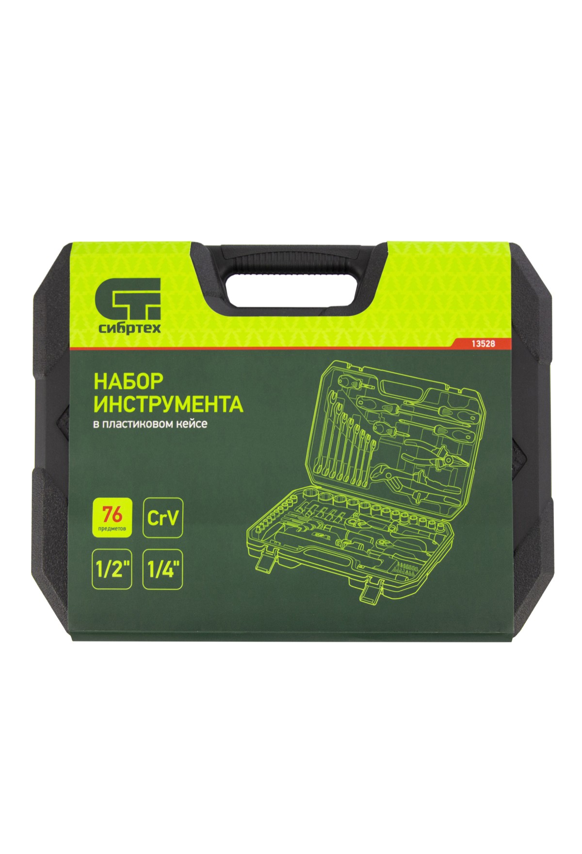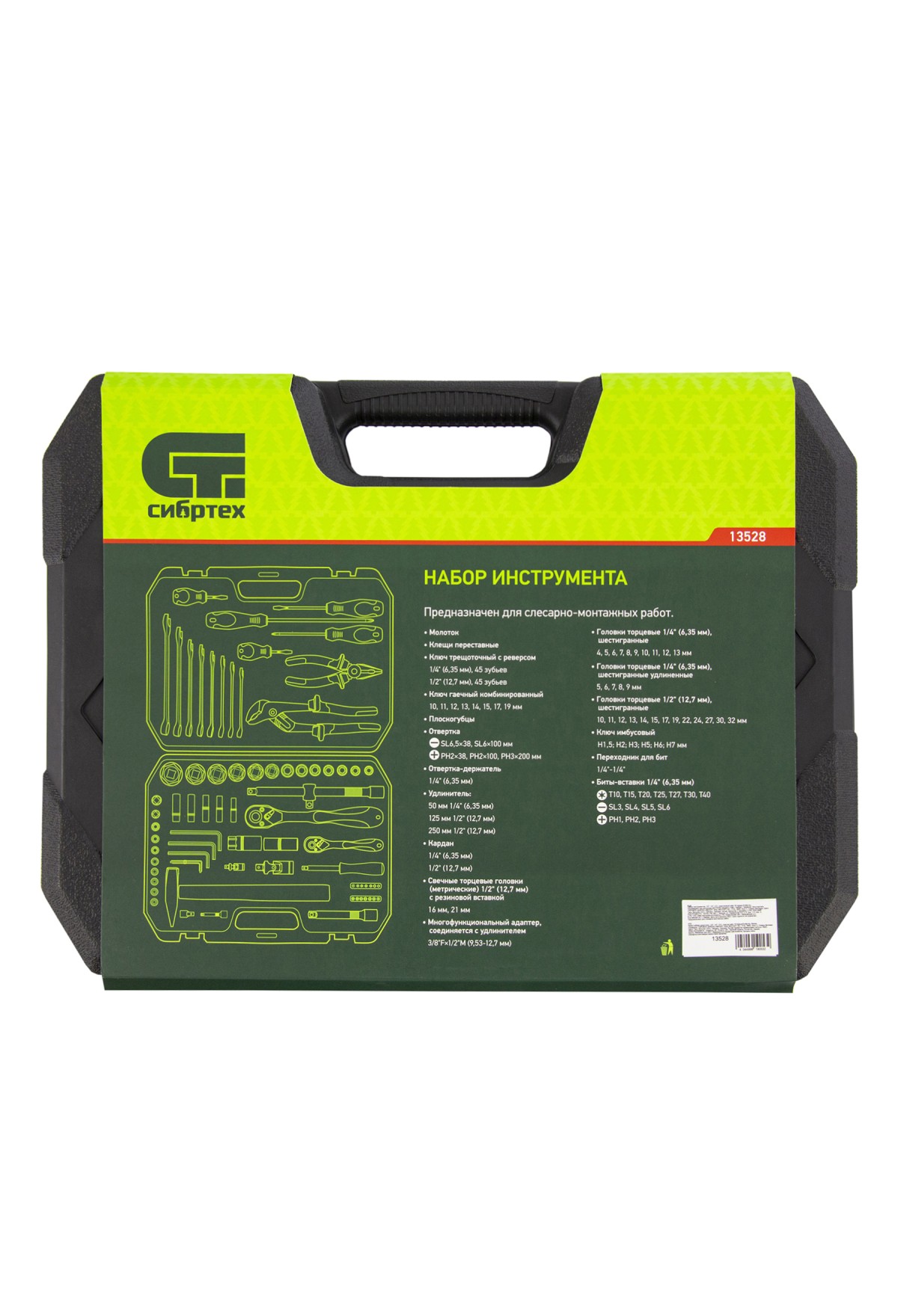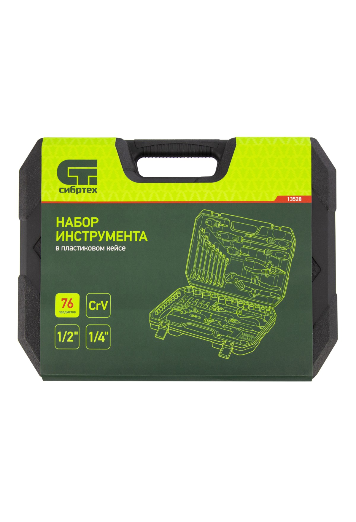 Набор инструментов Сибртех 13528 упакован в пластиковый кейс и состоит из 76 предметов из стали CrV, с присоединительными размерами 1/2"и 1/4". Предназначен для монтажа и демонтажа резьбового крепежа с разными типами шлицев, а также для проведения ударных и других слесарно-монтажных работ. В комплект поставки входят карданы, удлинители и переходники, облегчающие работу в труднодоступных местах. Набор используется для ремонта автомобилей, а также полезен в быту.