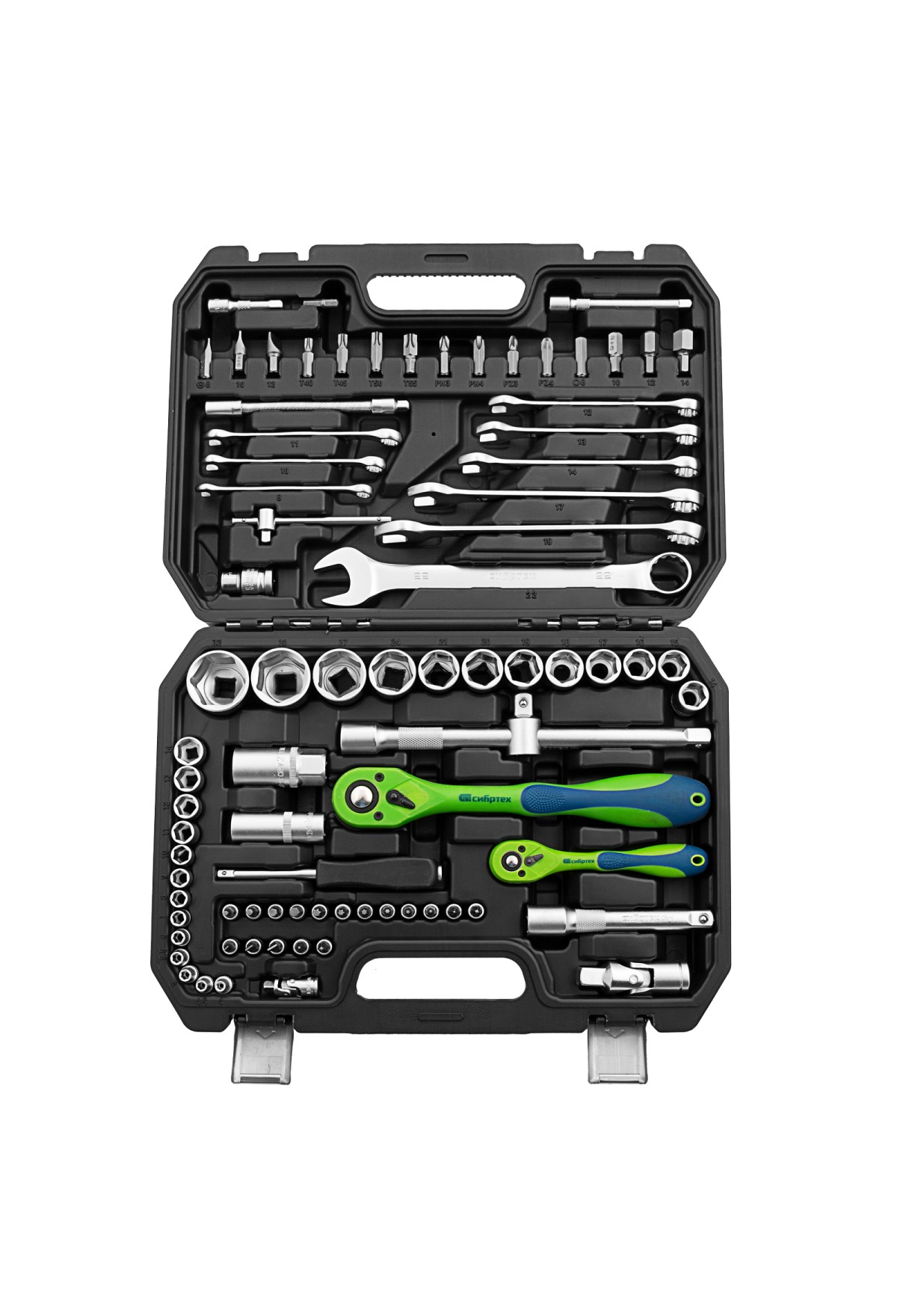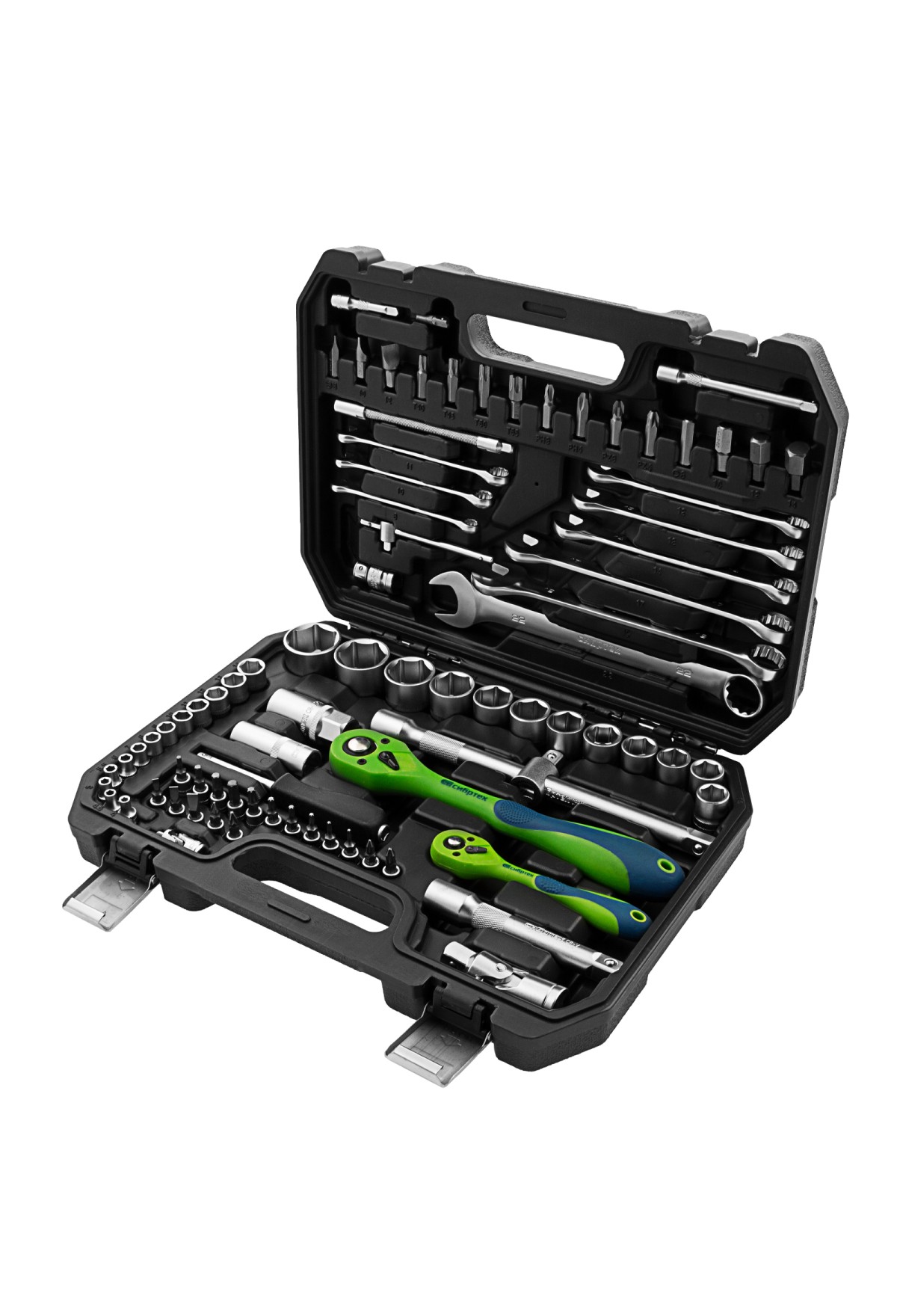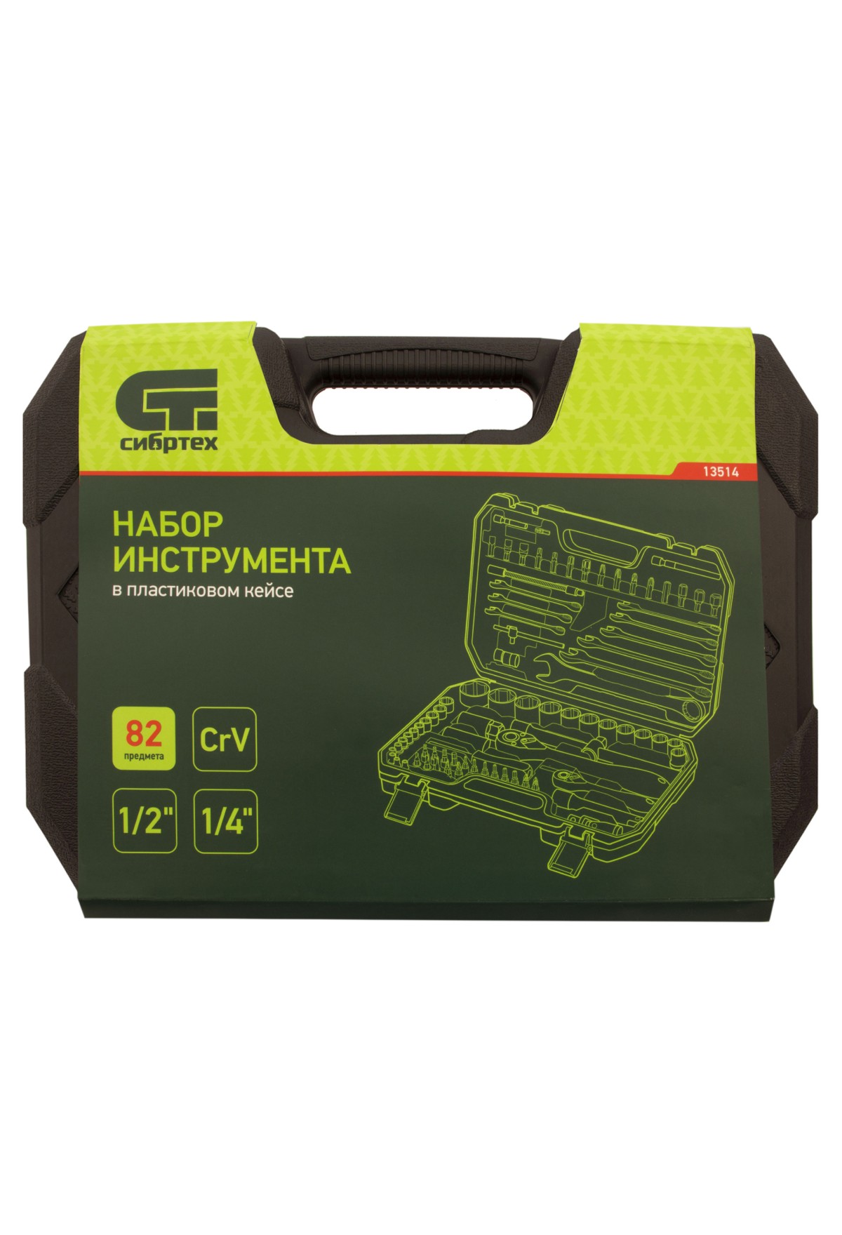 Набор инструментов Сибртех 13514 включает в себя 82 предмета из стали CrV, с присоединительными размерами 1/2"и 1/4", поставляется в пластиковом кейсе. Инструменты предназначенны для проведения слесарных работ, преимущественно монтажа и демонтажа резьбовых крепежей с разными типами шлицев. В комплект входят карданы, удлинители и переходники, облегчающие работу в труднодоступных местах. Набор используется для ремонта автомобилей, также пригодится в быту.