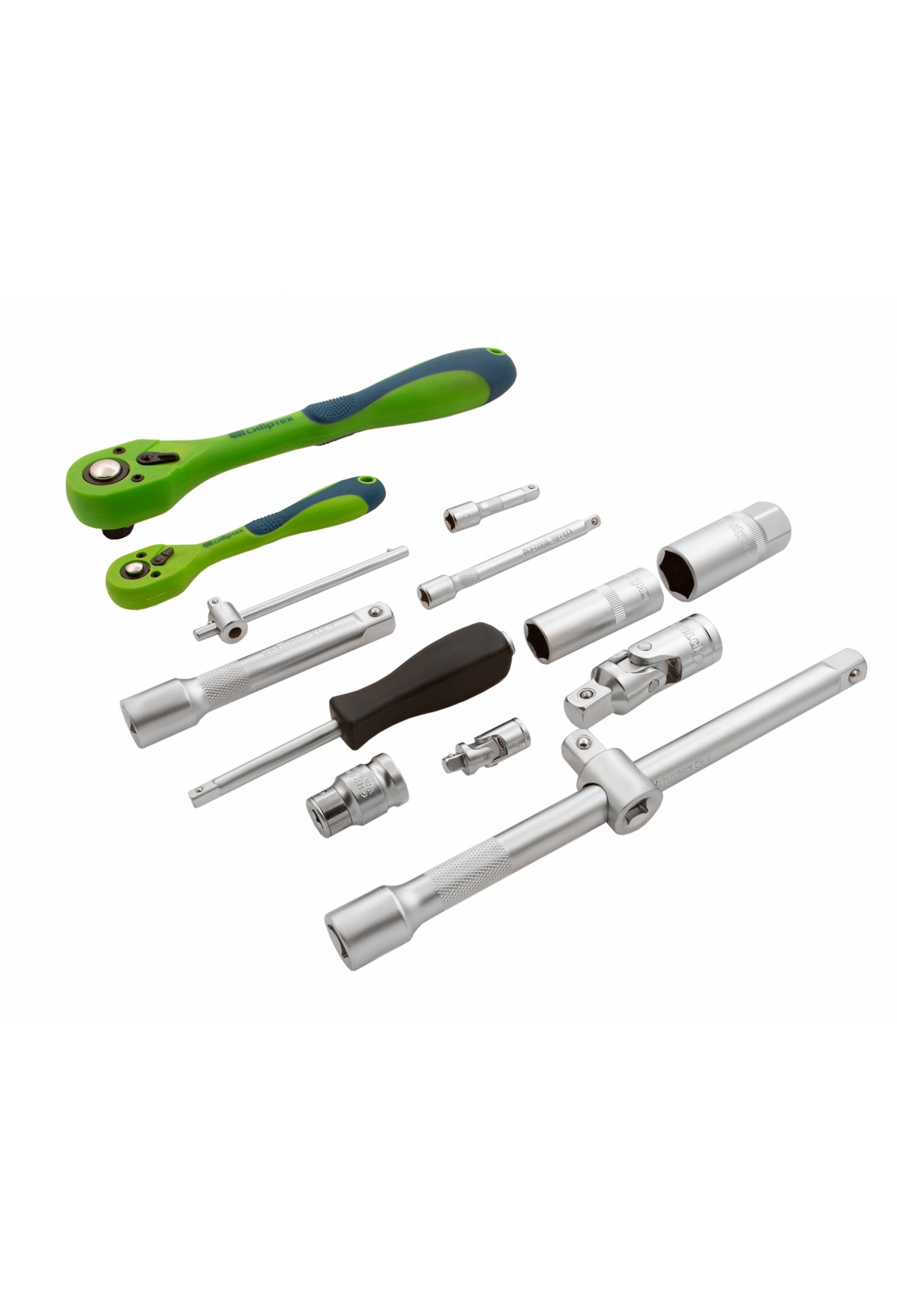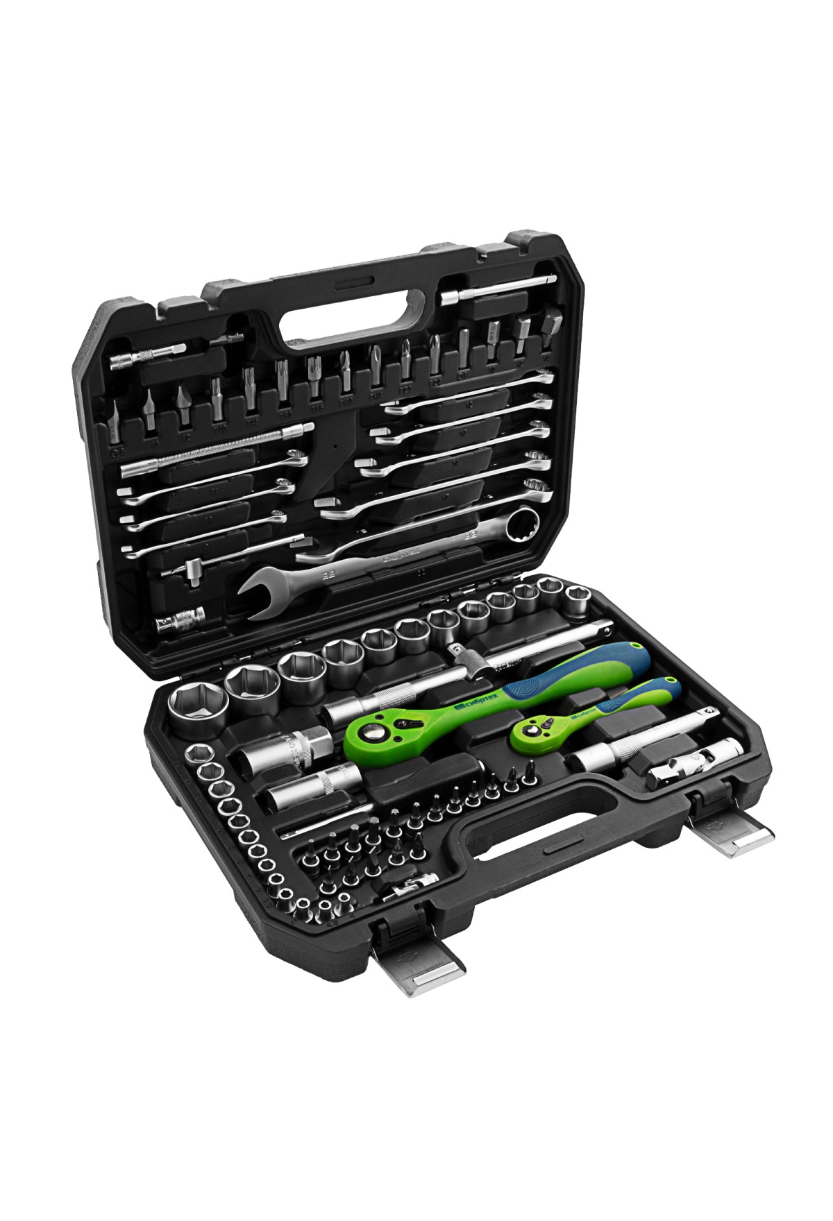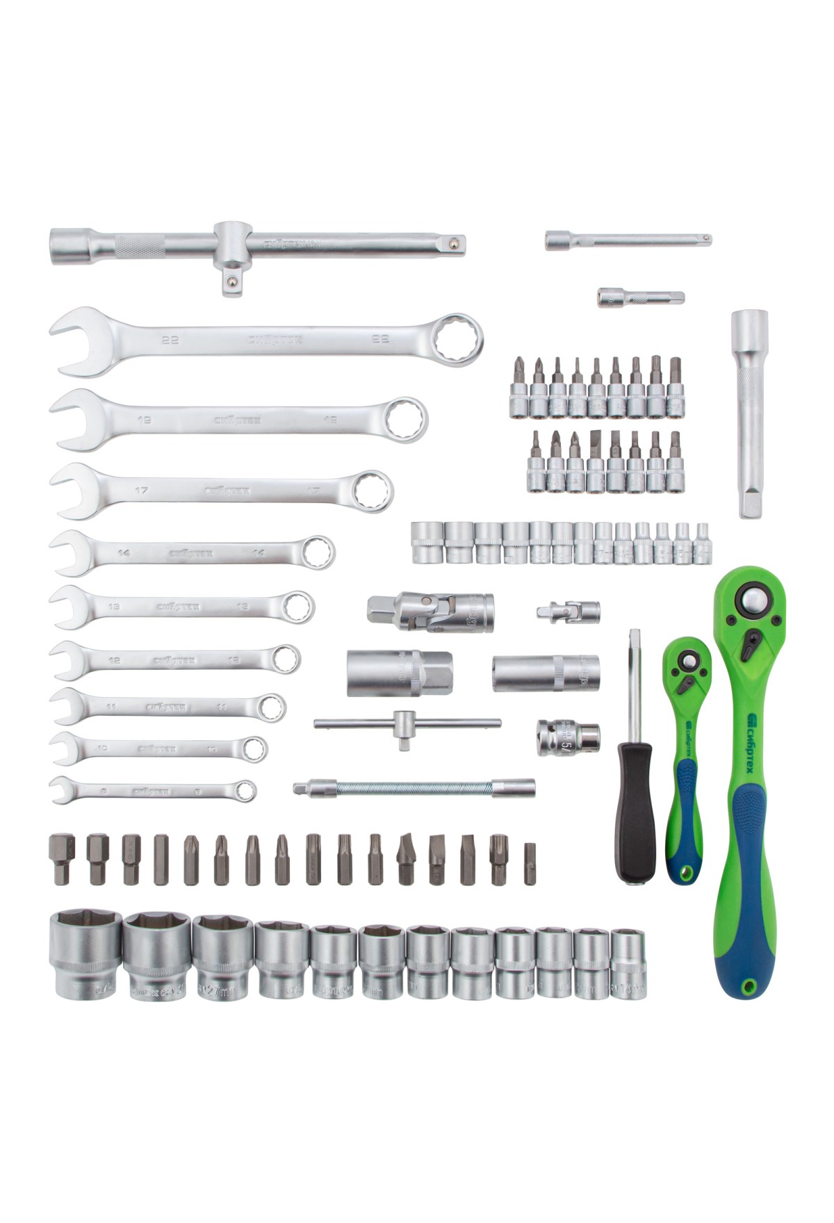 Набор инструментов Сибртех 13514 включает в себя 82 предмета из стали CrV, с присоединительными размерами 1/2"и 1/4", поставляется в пластиковом кейсе. Инструменты предназначенны для проведения слесарных работ, преимущественно монтажа и демонтажа резьбовых крепежей с разными типами шлицев. В комплект входят карданы, удлинители и переходники, облегчающие работу в труднодоступных местах. Набор используется для ремонта автомобилей, также пригодится в быту.