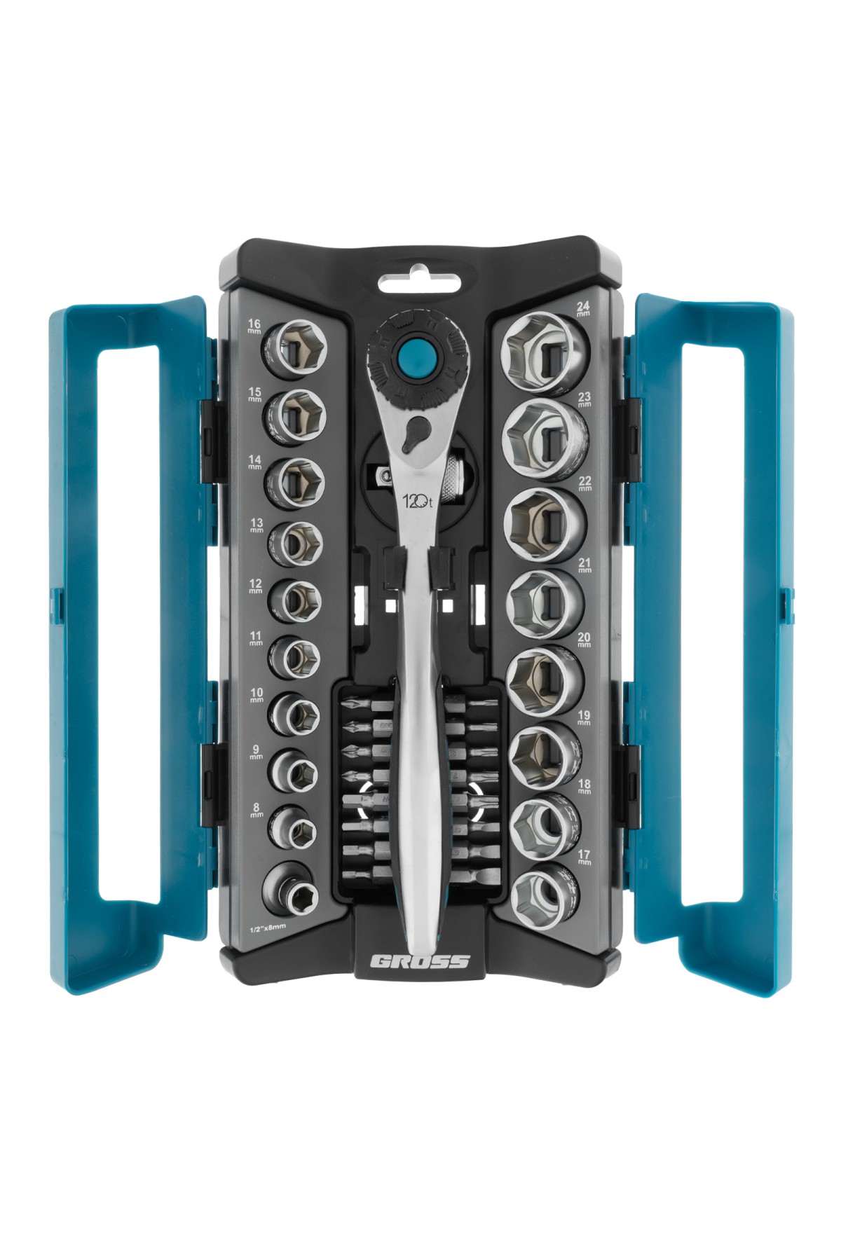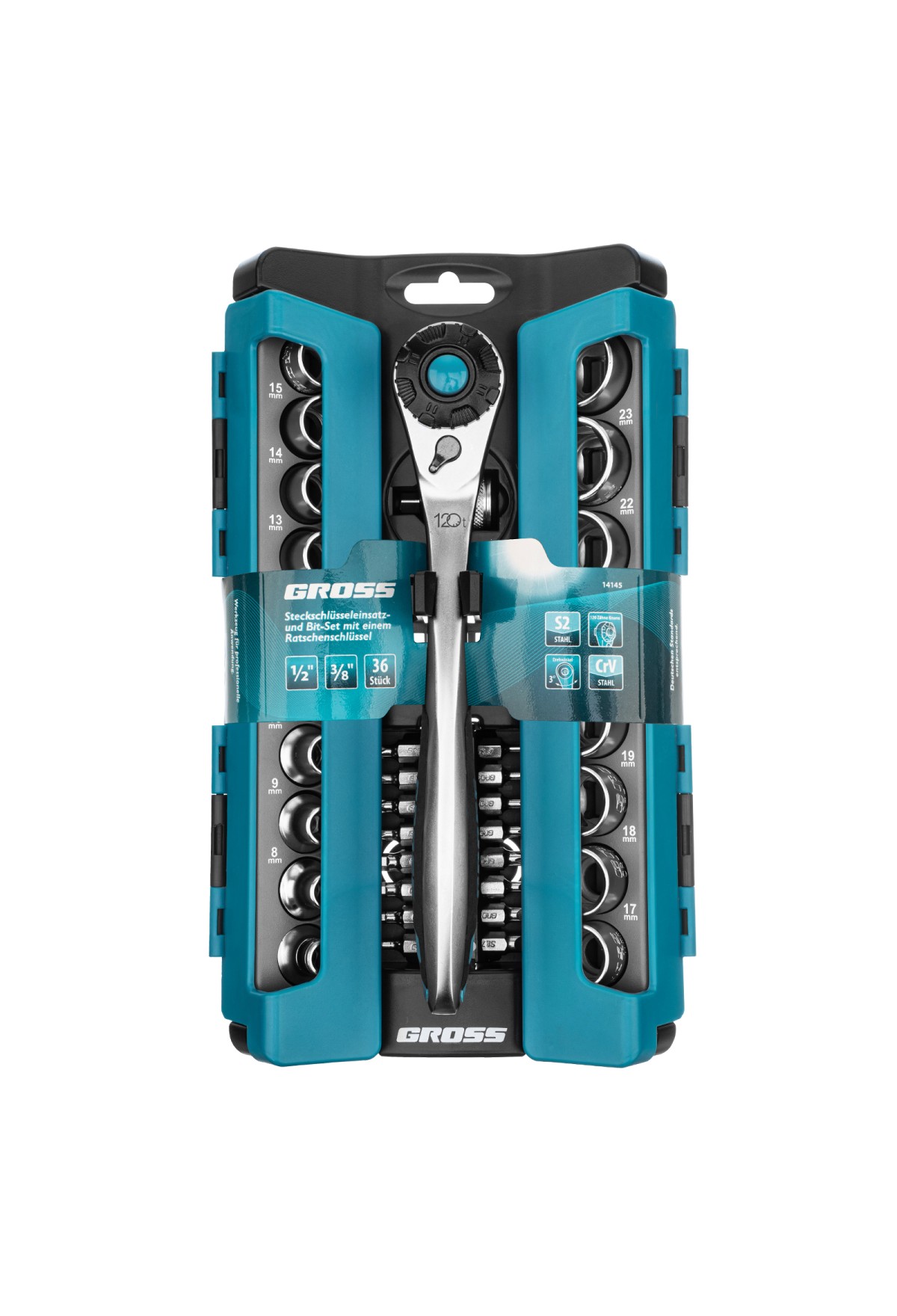 Набор Gross 14145 включает в себя 36 предметов из стали CrV-группы с посадочным квадратом 1/2 и 3/8 дюйма: 17 торцевых головок, трещотку со 120 зубьями, переходник, адаптер и 16 бит. Применяется для монтажа и демонтажа резьбовых соединений при проведении технического обслуживания авто или для бытовых ремонтных работ. Набор подходит не только для самостоятельного использования в гараже и дома, но и для профессиональной эксплуатации на станциях техобслуживания.