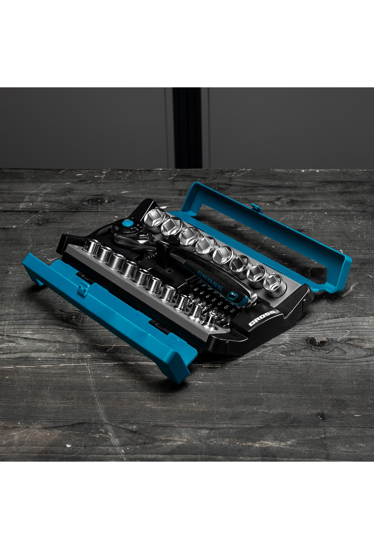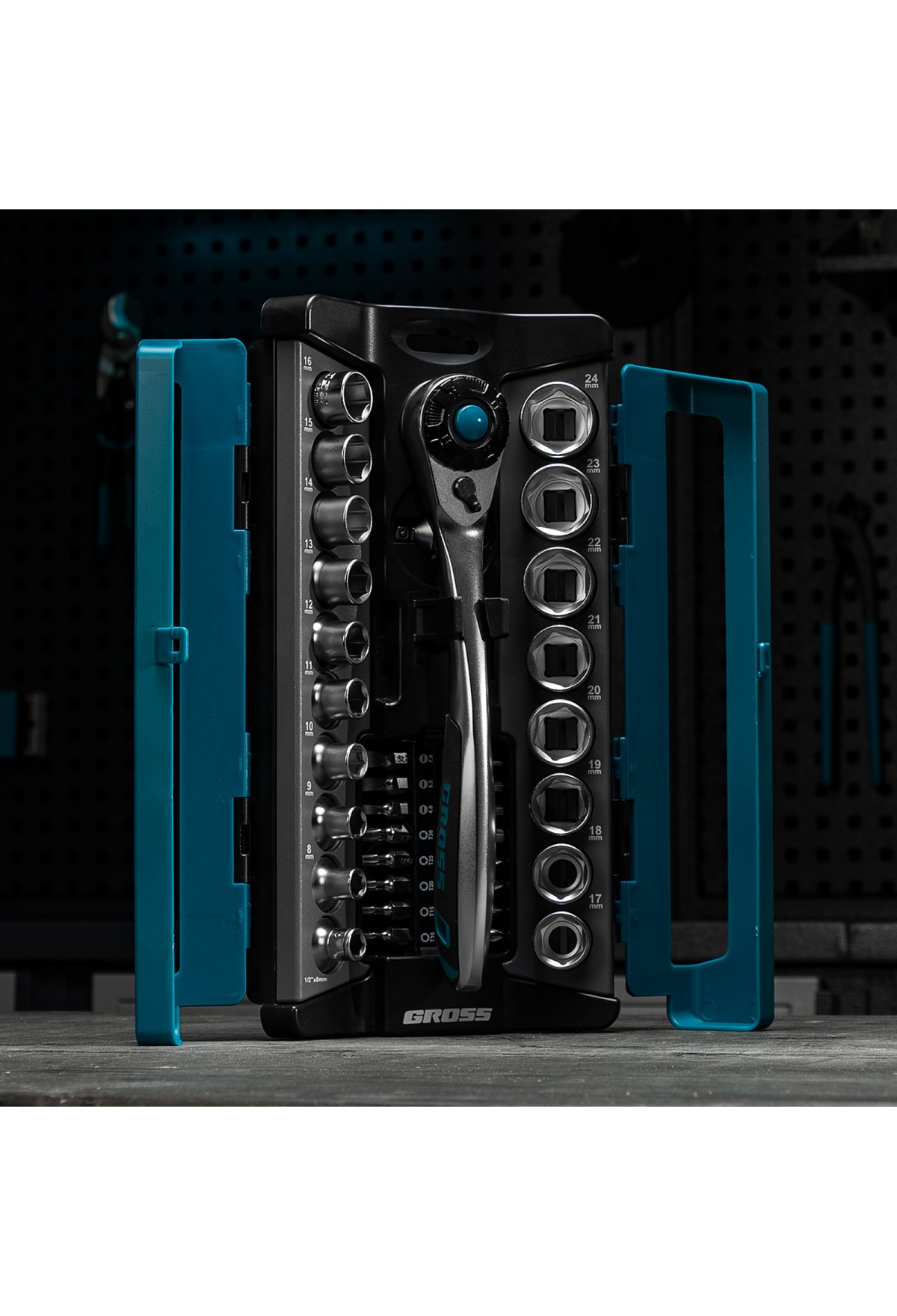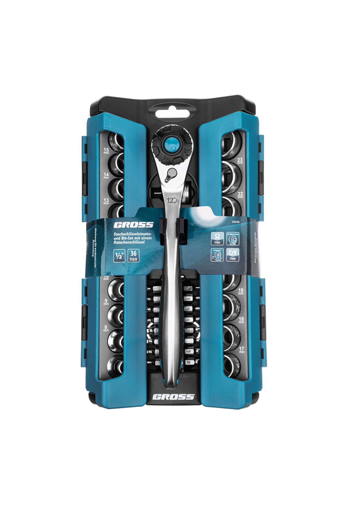 • Набор торцевых головок, трещотка 120 зубьев, 1/2", CrV, 36 предметов Gross
