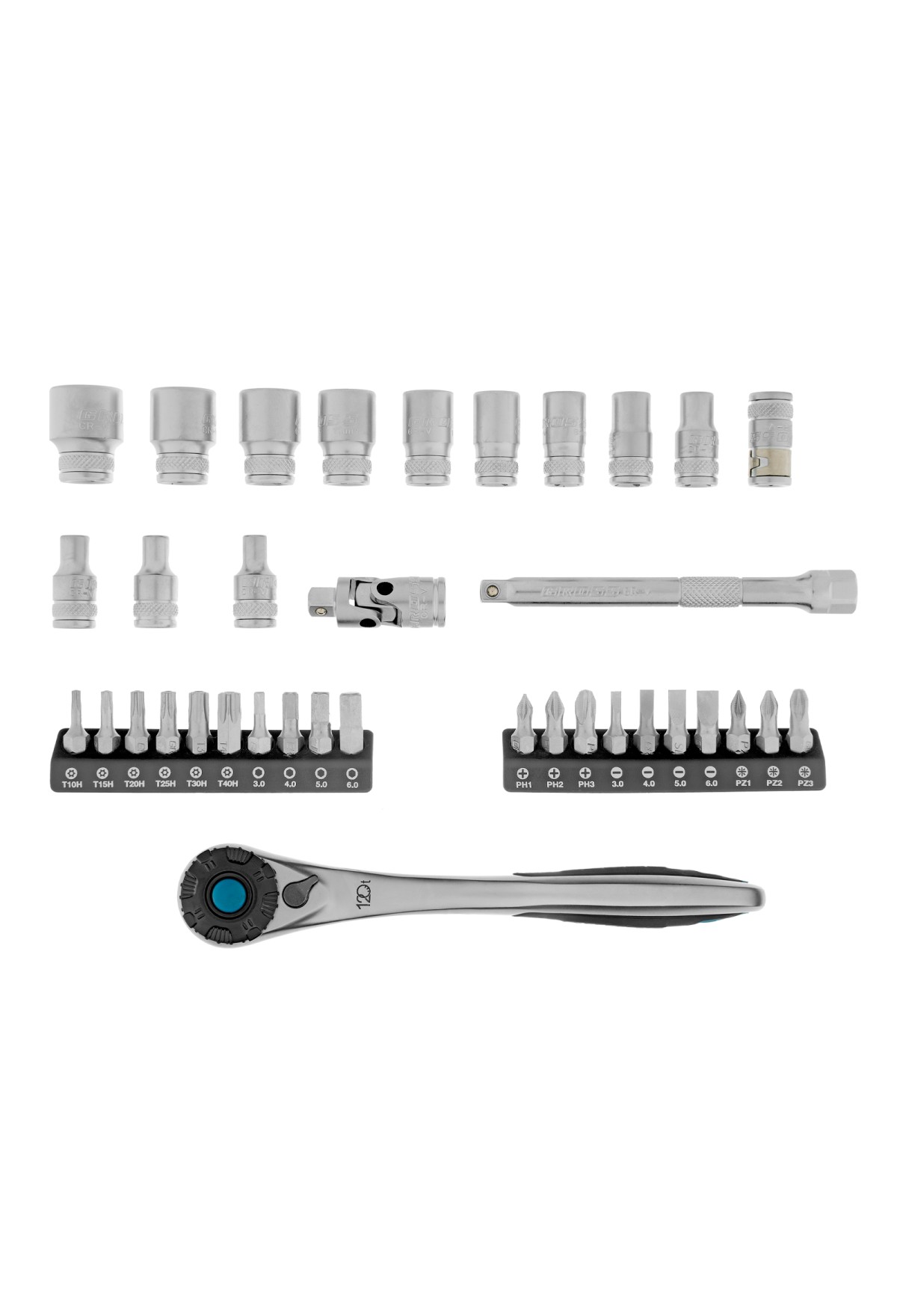Набор Gross 14142 включает в себя 36 предметов из стали CrV-группы с посадочным квадратом 1/4 дюйма: 12 торцевых головок, трещотку со 120 зубьями, удлинитель 100 мм, шарнир, адаптер и 20 бит. Применяется для монтажа и демонтажа резьбовых соединений при проведении технического обслуживания авто или для бытовых ремонтных работ. Набор подходит не только для самостоятельного использования в гараже и дома, но и для профессиональной эксплуатации на станциях техобслуживания.