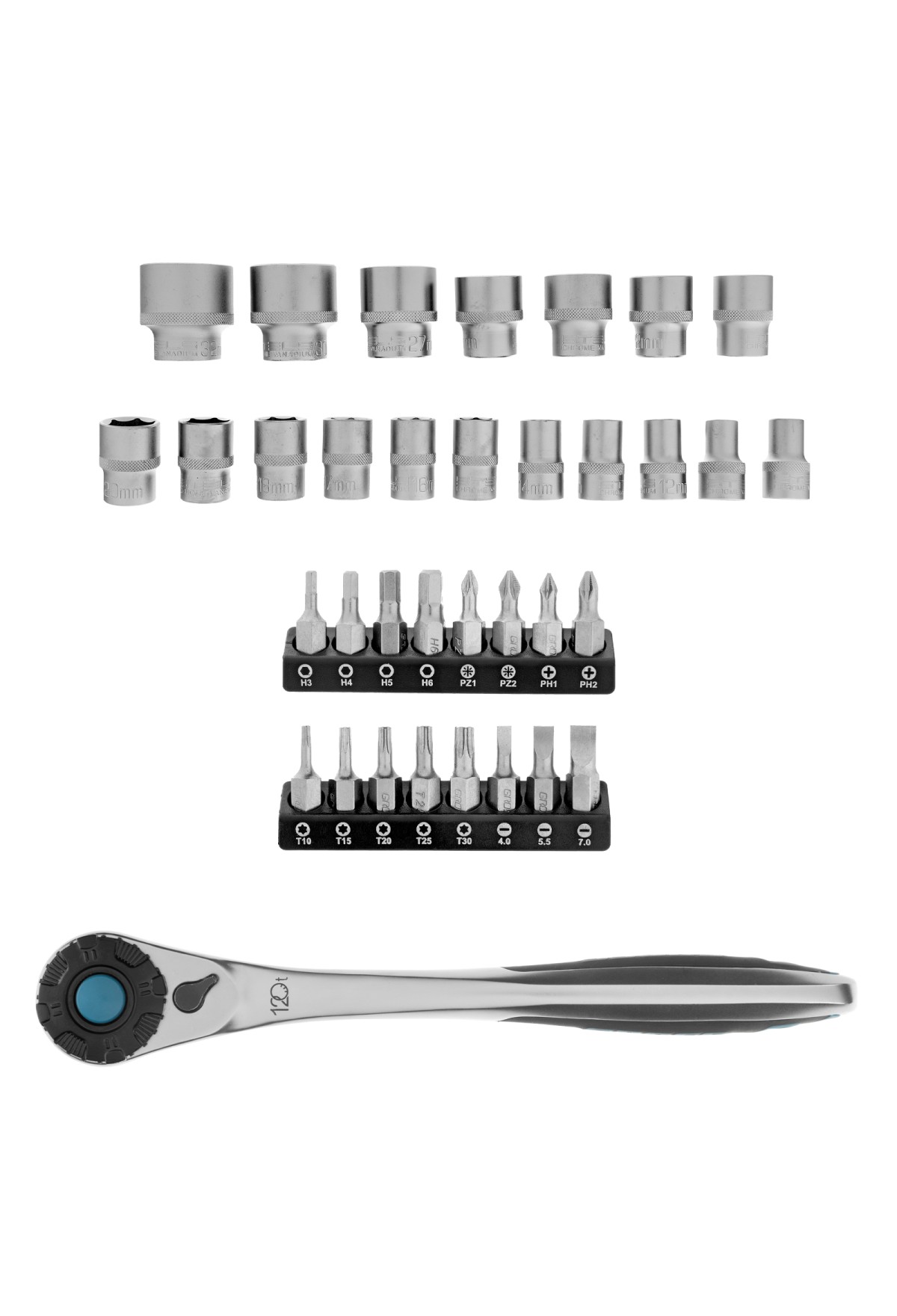 Комплектация Ключ трещоточный - 1 штАдаптер для бит - 1 штПереходник - 1 штБиты-вставки PH, PZ, SL, H, T, - 16 штГоловки 8, 9, 10, 11, 12, 13, 14, 15, 16, 17, 18, 19, 20, 21, 22, 23, 24 - 17 штКейс - 1 шт