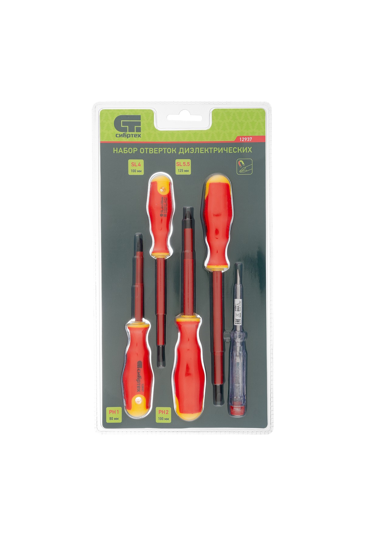 Набор диэлектрических отверток и тестер Сибртех 12937, CrV, с двухкомпонентными рукоятками, состоит из 5 предметов, которые пригодятся при обслуживании электрооборудования и электроприборов. Диэлектрическое покрытие защищает оператора от поражения током во время работ под напряжением до 1000 В. Широкий диапазон длины стержней отверток 80-125 мм позволяет выбрать оптимальную в зависимости от степени углубления крепежа. Важно — техника безопасности запрещает работу под напряжением даже при использовании инструмента с диэлектрическим покрытием!