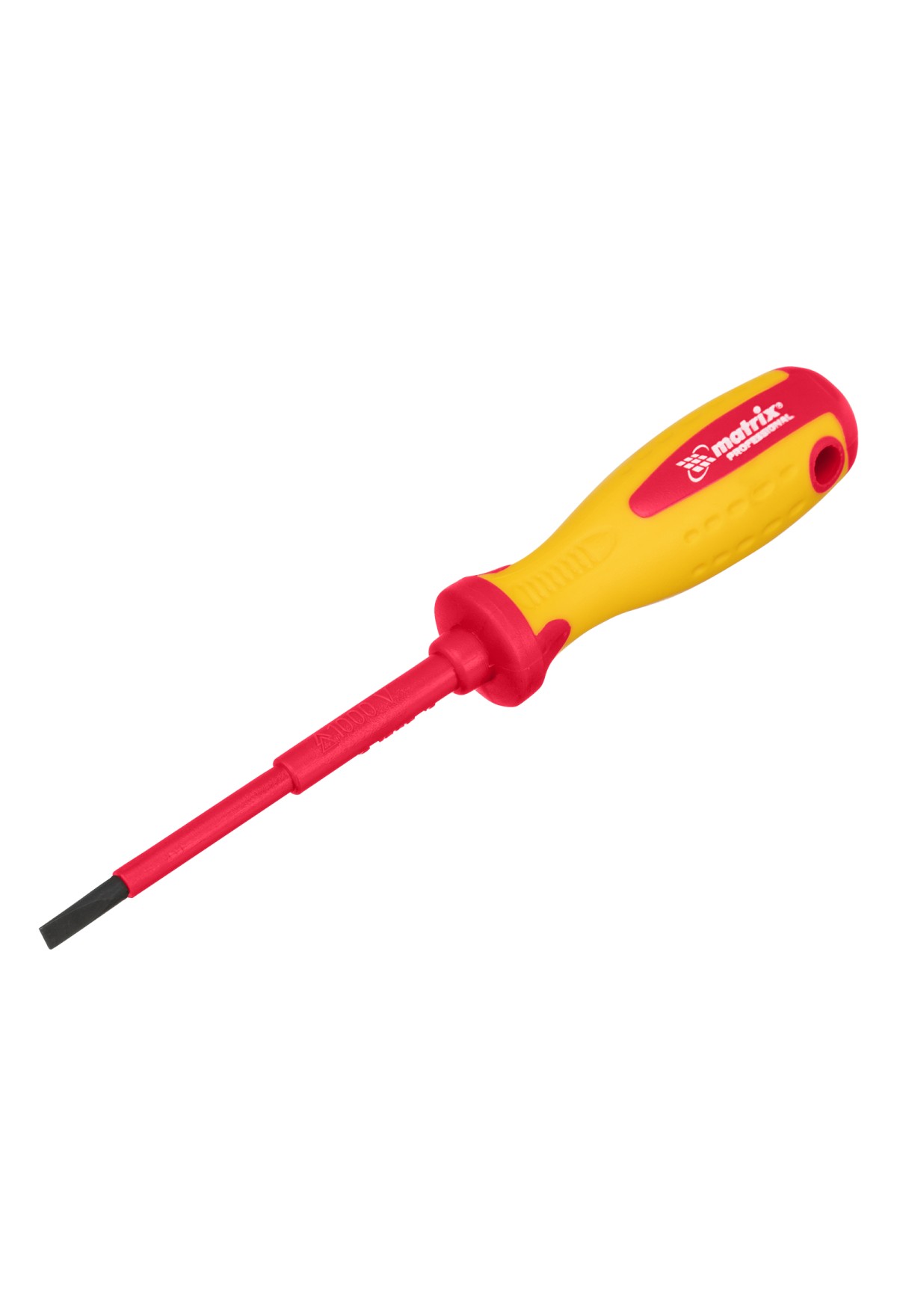 Отвертка Matrix Insulated 12916, SL4,0 x 100 мм, из стали CrMo, с двухкомпонентной рукояткой до 1000 В, используется при проведении ремонтных с крепежом типа Slotted «минус». Благодаря диэлектрическому покрытию она выдерживает напряжение до 1000 В, поэтому оптимально подходит для настройки электрооборудования, установки розеток и др. Важно — техника безопасности запрещает работать под напряжением!