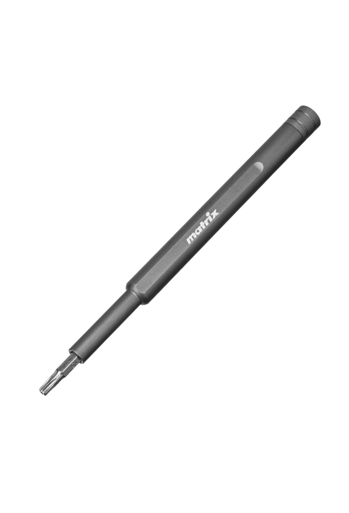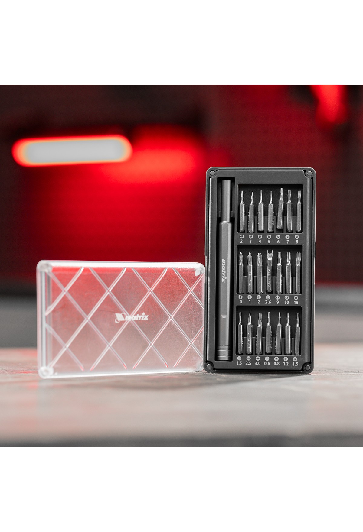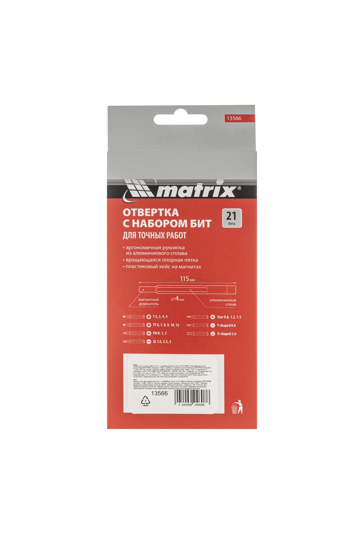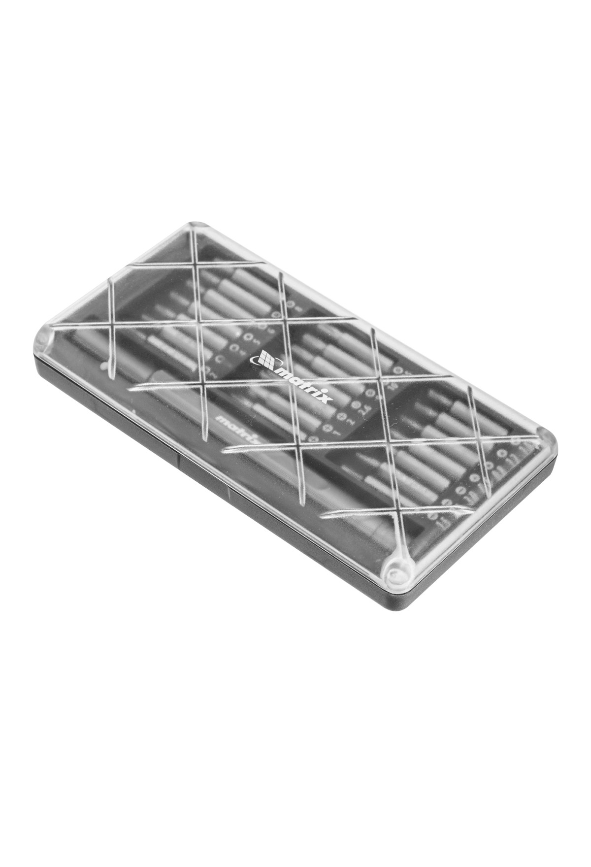 Универсальный набор для точных работ Matrix 13566 22 в 1 содержит 21 биту под шлицы PH, SL,T, H, Str, Y и U, а также отвертку-держатель. Вращающийся затыльник позволяет поворачивать отвертку перебором пальцев, что упрощает работу с мелким крепежом. При помощи входящих в набор инструментов можно отремонтировать очки, игрушки, портативную и бытовую технику и т.д.