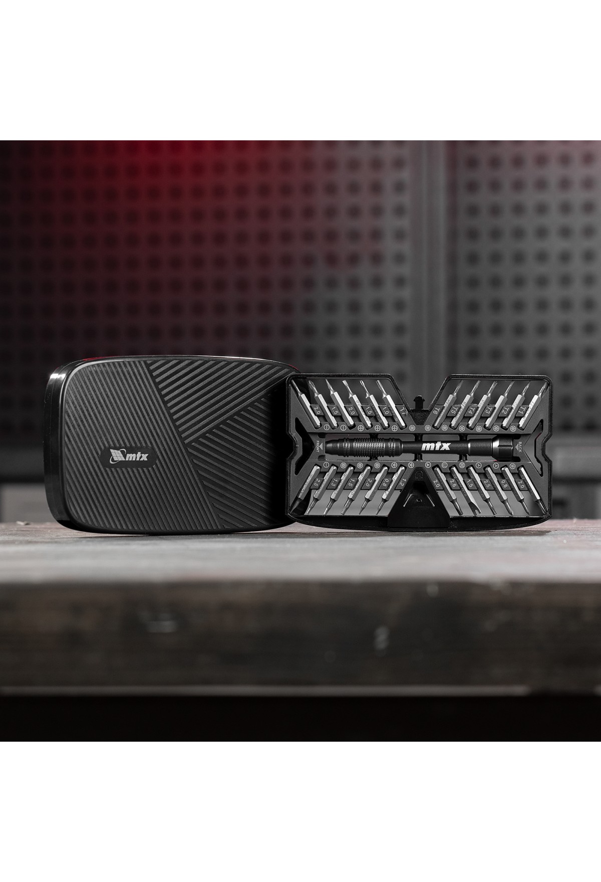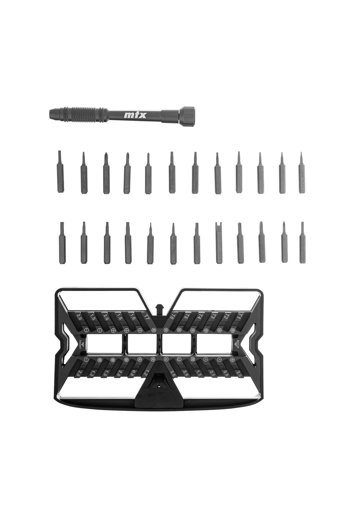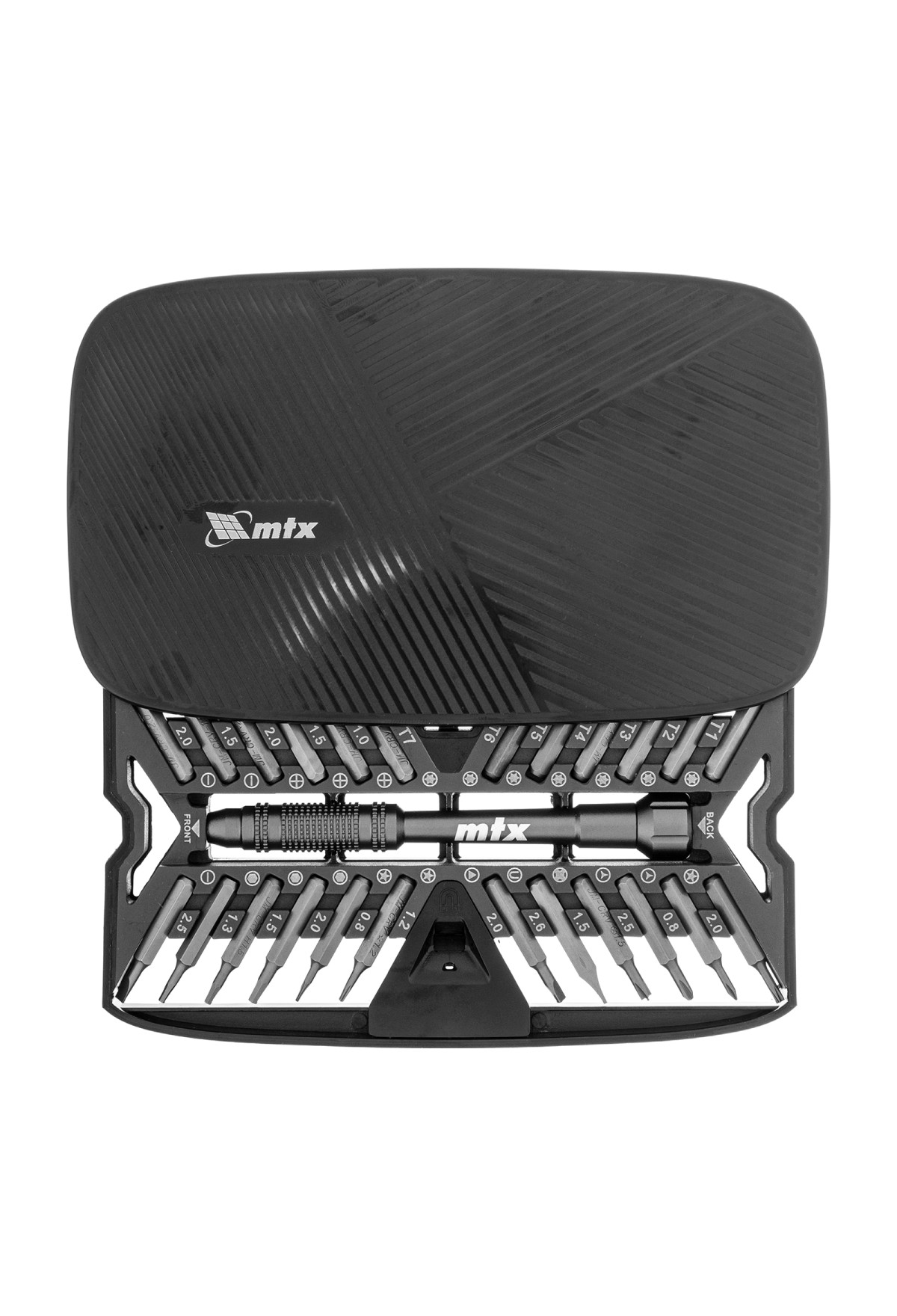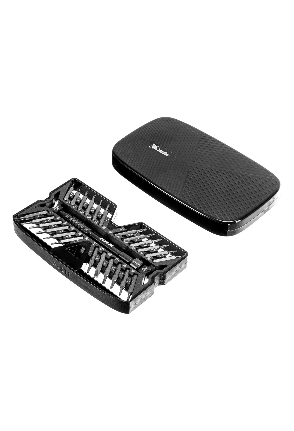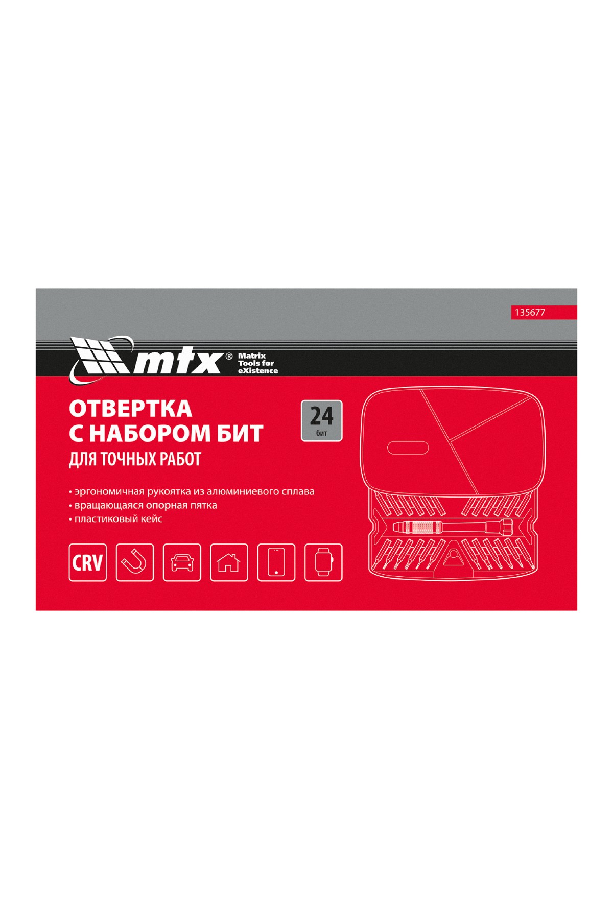 Набор для точных работ 26 в 1 MTX 135677 содержит 24 биты с наконечниками PH, SL,T, H, Str, Y, St, TR, U, отвертку и пластиковый кейс. С его помощью можно отремонтировать очки, игрушки, портативную и бытовую технику и т.д.