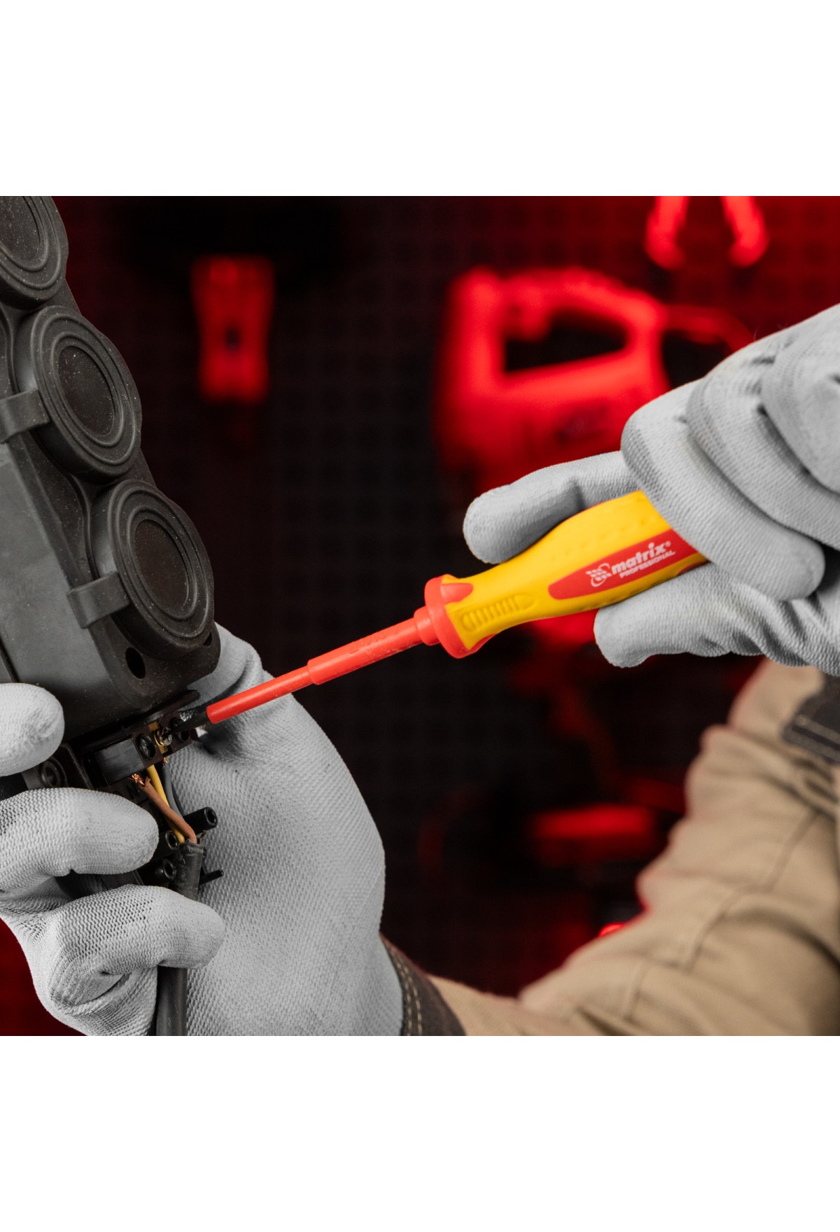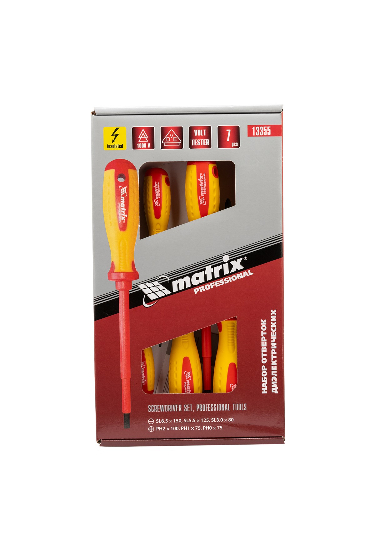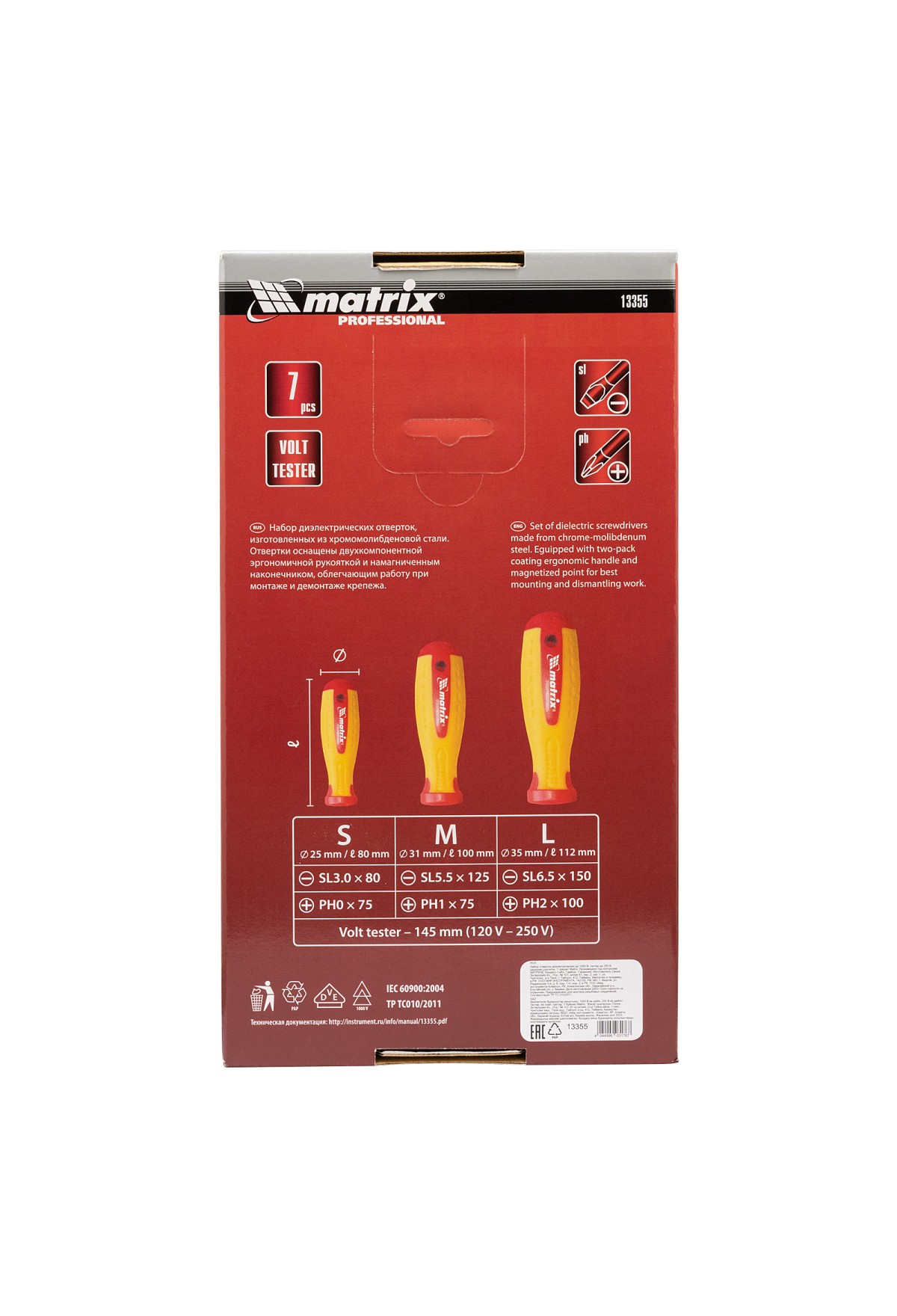 Набор диэлектрических отверток Matrix 13355 состоит из 7 предметов: 6 отверток с двухкомпонентными рукоятками, выдерживающих напряжение до 1000 В, и тестера до 250 В. Предназначен для проведения электромонтажных работ. Отвертки полностью покрыты изолирующим материалом, защищающим мастера от поражения электрическим током. Подходят для шлицев SL и PH. Входящий в комплект тестер позволяет быстро определить наличие напряжения в сети. Набор рекомендован для профессионального применения.,Важно — перед выполнением работ следует обесточить сеть либо отключить от нее прибор!