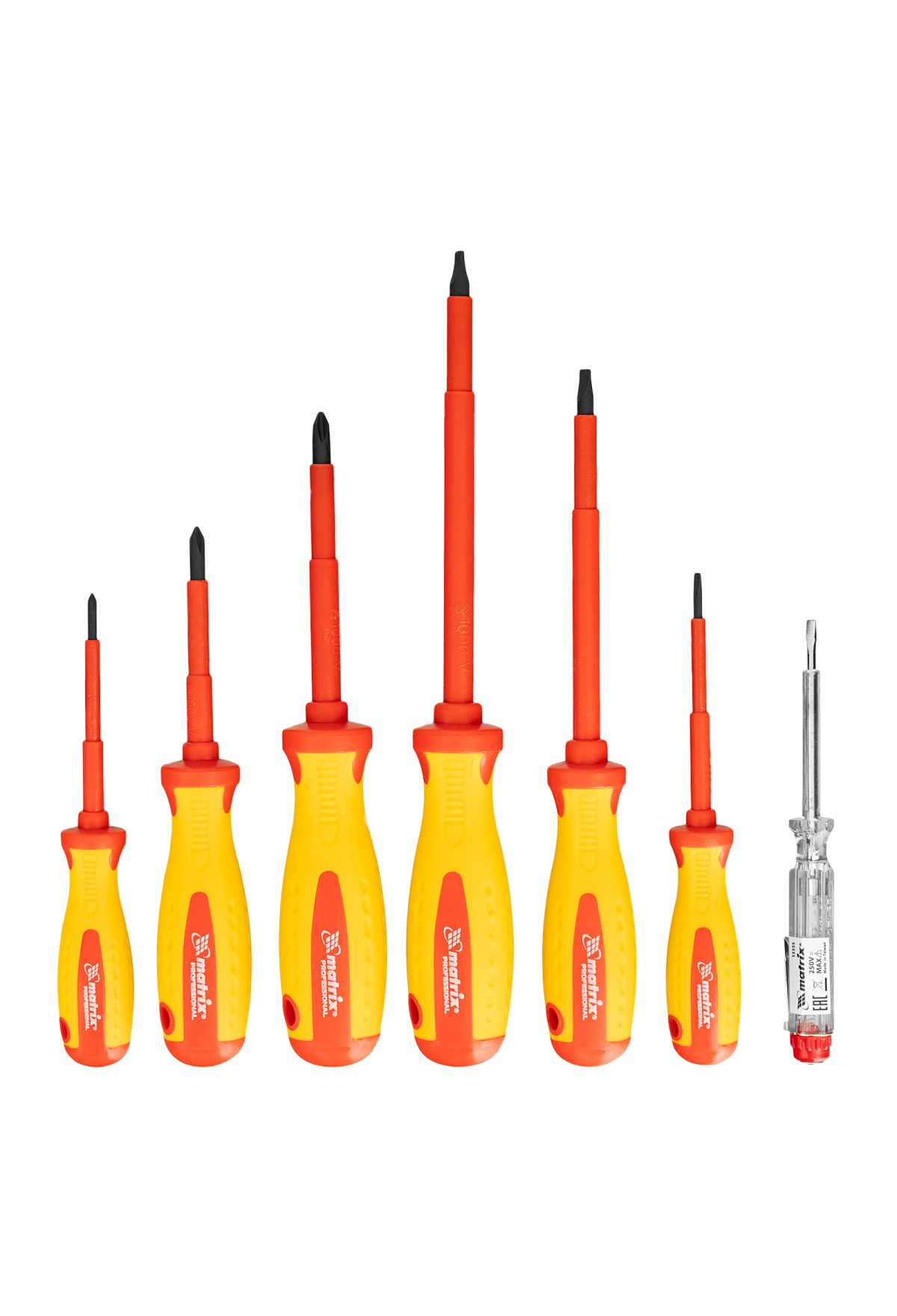 Набор диэлектрических отверток Matrix 13355 состоит из 7 предметов: 6 отверток с двухкомпонентными рукоятками, выдерживающих напряжение до 1000 В, и тестера до 250 В. Предназначен для проведения электромонтажных работ. Отвертки полностью покрыты изолирующим материалом, защищающим мастера от поражения электрическим током. Подходят для шлицев SL и PH. Входящий в комплект тестер позволяет быстро определить наличие напряжения в сети. Набор рекомендован для профессионального применения.,Важно — перед выполнением работ следует обесточить сеть либо отключить от нее прибор!