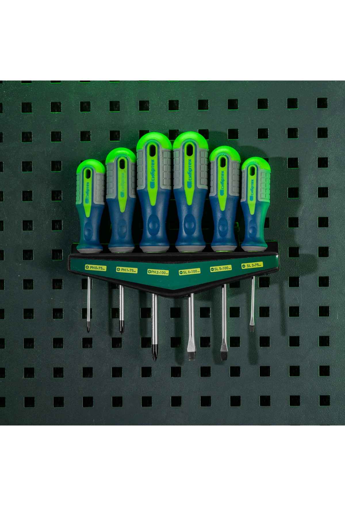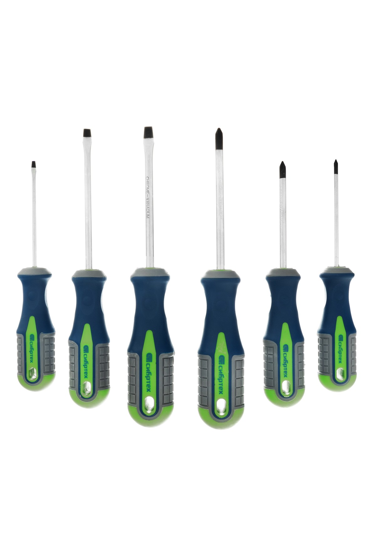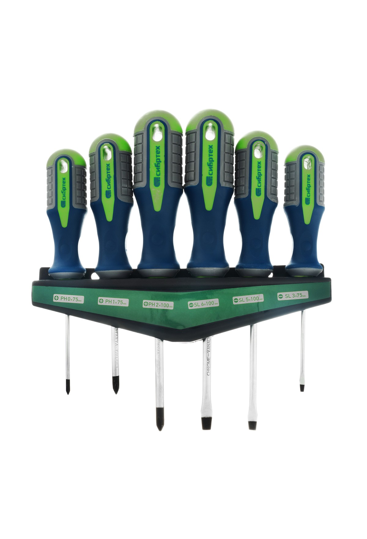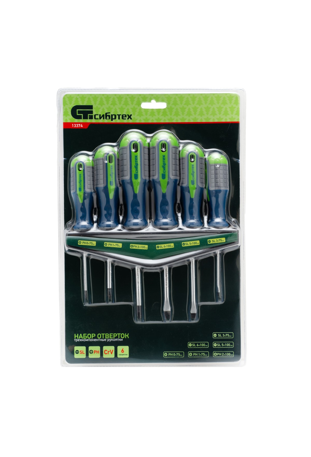 Набор отверток Сибртех 13374 включает в себя 6 предметов из стали CrV с трехкомпонентными рукоятками, которые будут полезны мастерам при осуществлении несложных ремонтных и монтажных работ. С их помощью можно производить монтаж/демонтаж резьбового крепежа с профилем SL и PH. Длина стержней отверток составляет 75-100 мм для удобства работы с крепежом на поверхностях и в небольших углублениях.
