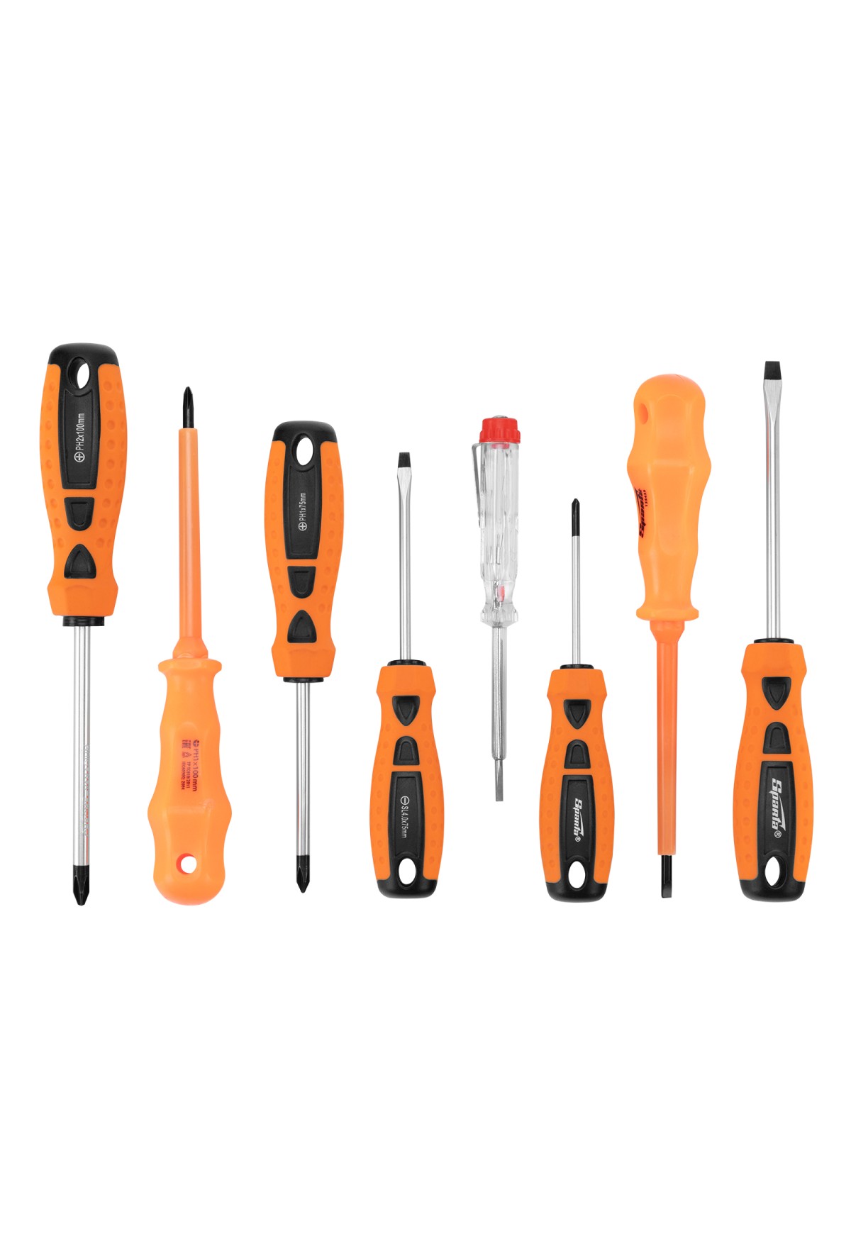 Набор отверток Sparta 135435 включает 8 предметов: 5 отверток для монтажа/демонтажа крепежных элементов с профилем PH и SL, 2 диэлектрические отвертки и электрический пробник на 220 В. Он пригодится для ремонта и обслуживания электрооборудования в быту. Важно — техника безопасности исключает проведение работ под напряжением!
